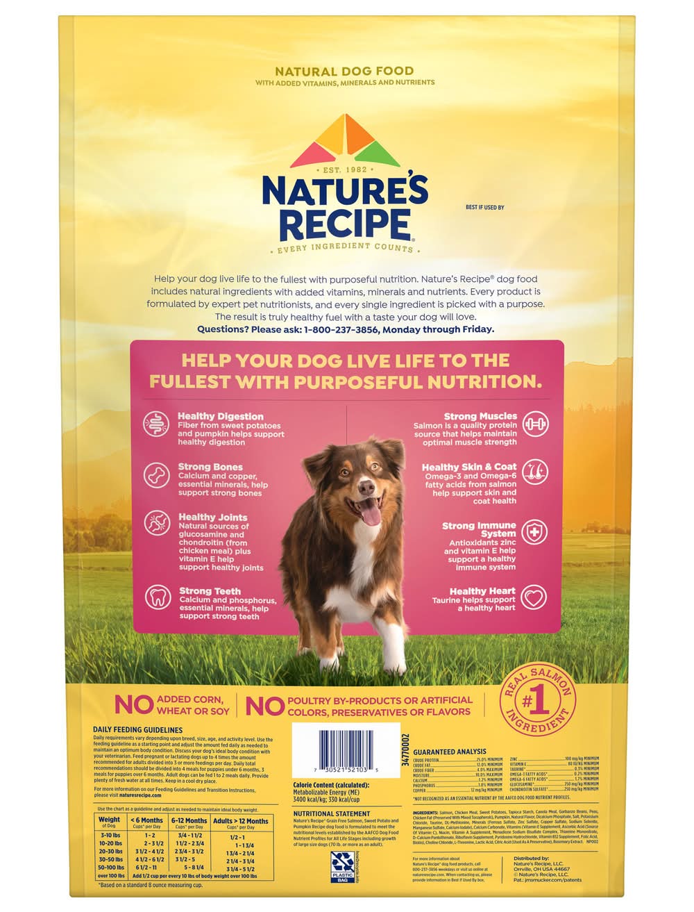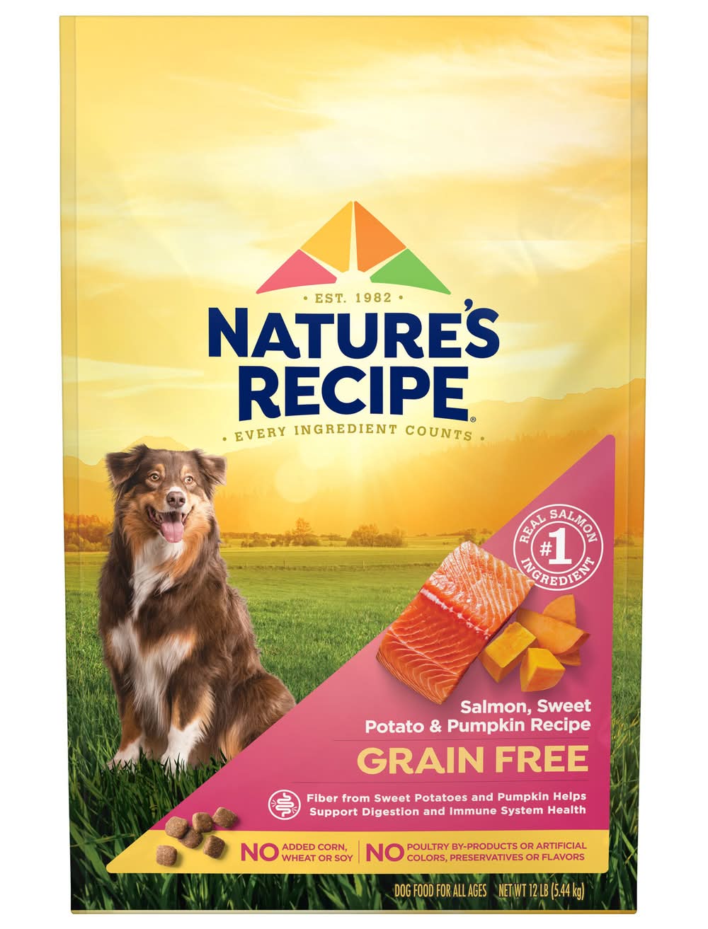 Nature's Recipe Grain Free Salmon, Sweet Potato & Pumpkin Recipe dry dog food makes it easier (and more satisfying) than ever to fuel your dog. This dog food is made with real salmon as the number one ingredient, along with nutrient-dense carbohydrate sources like sweet potato and pumpkin. Fiber, active nutrients and antioxidants also help support digestion, immune system health and many other aspects of your dog's overall health with every bite. We don't include anything that would cause our recipe to fall short of amazing -there's no added corn, wheat or soy protein, no poultry by-product meal and no artificial flavors or preservatives. Pick up a bag for your best buddy today. Nature's Recipe, LLC., Orrville,OH.