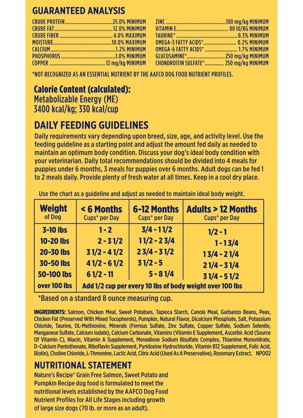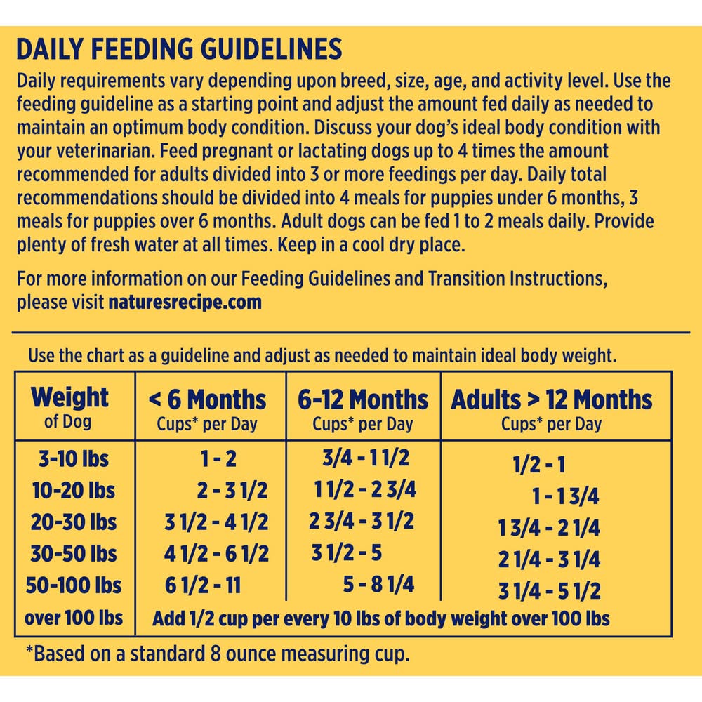 Daily feeding guidelines: weight of dog: 3 - 10 (lb); less than 6 months: 1 - 2 cups (based on a standard 8 oz measuring cup) per day; 6 - 12 months: 3/4 - 1-1/2 cups (based on a standard 8 oz measuring cup) per day; adults over 12 months: 1/2 - 1 cups (based on a standard 8 oz measuring cup) per day. weight of dog: 10 - 20 (lb); less than 6 months: 2 ��������� 3-1/2 cups (based on a standard 8 oz measuring cup) per day; 6 - 12 months: 1-1/2 - 2-3/4 cups (based on a standard 8 oz measuring cup) per day; adults over 12 months: 1 - 1-3/4 cups (based on a standard 8 oz measuring cup) per day. weight of dog: 20 - 30 (lb); less than 6 months: 3-1/2 - 4-1/2 cups (based on a standard 8 oz measuring cup) per day; 6 - 12 months: 2-3/4 - 3-1/2 cups (based on a standard 8 oz measuring cup) per day; adults over 12 months: 1-3/4 - 2-1/4 cups (based on a standard 8 oz measuring cup) per day. weight of dog: 30 - 50 (lb); less than 6 months: 4-1/2 - 6-1/2 cups (based on a standard 8 oz measuring cup) per day; 6 - 12 months: 3-1/2 - 5 cups (based on a standard 8 oz measuring cup) per day; adults over 12 months: 2-1/4 - 3-1/4 cups (based on a standard 8 oz measuring cup) per day. weight of dog: 50 - 100 (lb); less than 6 months: 6-1/2 - 11 cups (based on a standard 8 oz measuring cup) per day; 6 - 12 months: 5 ��������� 1-1/4 cups (based on a standard 8 oz measuring cup) per day; adults over 12 months: 3-1/4 - 5-1/2 cups (based on a standard 8 oz measuring cup) per day. weight of dog: over 100 (lb); add 1/2 cup per every 10 lb of body weight over 100 lb. feeding instructions: your dog's food requirements vary depending upon breed, size, age, level of activity and environment. use the chart as a guideline and adjust as needed to maintain optimum body weight. feed pregnant or lactating dogs up to 4 times the amount recommended for adults divided into 3 or more feedings per day. feed puppies the amount recommended divided into 2 or more feedings per day. provide plenty of fresh water at all times.