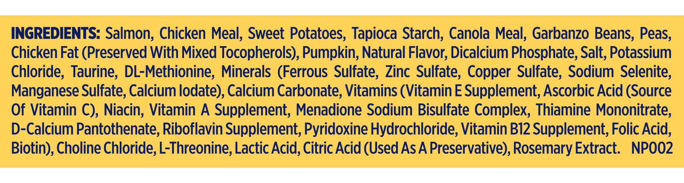 Ingredients: Salmon, Chicken Meal, Sweet Potatoes, Tapioca Starch, Canola Meal, Garbanzo Beans, Peas, Chicken Fat (preserved With Mixed Tocopherols), Pumpkin, Natural Flavor, Dicalcium Phosphate, Salt, Potassium Chloride, Taurine, Dl-methionine, Minerals (ferrous Sulfate, Zinc Sulfate, Copper Sulfate, Sodium Selenite, Manganese Sulfate, Calcium Iodate), Calcium Carbonate, Vitamins (vitamin E Supplement, Ascorbic Acid (source Of Vitamin C), Niacin, Vitamin A Supplement, Menadione Sodium Bisulfate Complex, Thiamine Mononitrate, D-calcium Pantothenate, Riboflavin Supplement, Pyridoxine Hydrochloride, Vitamin B12 Supplement, Folic Acid, Biotin), Choline Chloride, L-threonine, Lactic Acid, Citric Acid (used As A Preservative), Rosemary Extract. Contains: Fish