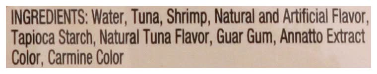 Ingredients: Water, Tuna, Shrimp, Natural and Artificial Flavor, Tapioca Starch, Natural Tuna Flavor, Guar Gum, Annatto Extract Color, Carmine Color Contains: Fish, Crustacean Shellfish