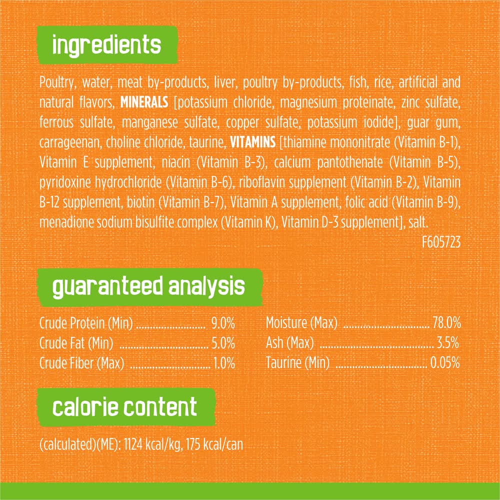 Ingredients: Poultry, Water, Meat By-Products, Liver, Poultry By-Products, Fish, Rice, Artificial And Natural Flavors, MINERALS [Potassium Chloride, Magnesium Proteinate, Zinc Sulfate, Ferrous Sulfate, Manganese Sulfate, Copper Sulfate, Potassium Iodide], Guar Gum, Carrageenan, Choline Chloride, Taurine, VITAMINS [Thiamine Mononitrate (Vitamin B-1), Vitamin E Supplement, Niacin (Vitamin B-3), Calcium Pantothenate (Vitamin B-5), Pyridoxine Hydrochloride (Vitamin B-6), Riboflavin Supplement (Vitamin B-2), Vitamin B-12 Supplement, Biotin (Vitamin B-7), Vitamin A Supplement, Folic Acid (Vitamin B-9), Menadione Sodium Bisulfite Complex (Vitamin K), Vitamin D-3 Supplement], Salt.\tF605723 Contains: Fish, Wheat, Gluten, Soybeans