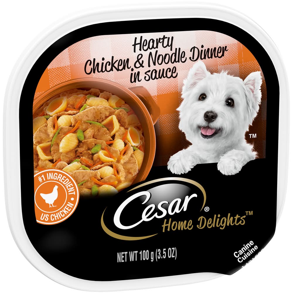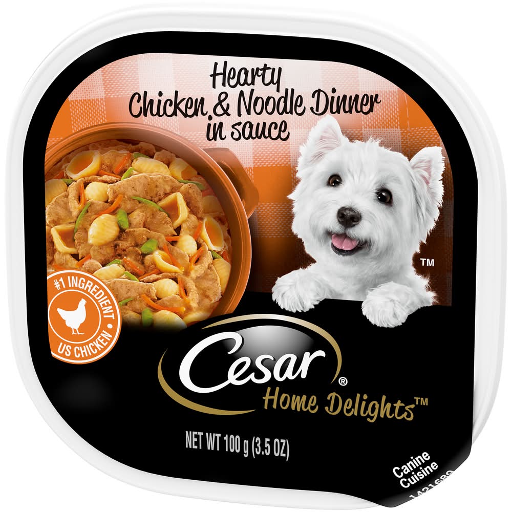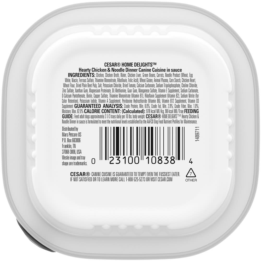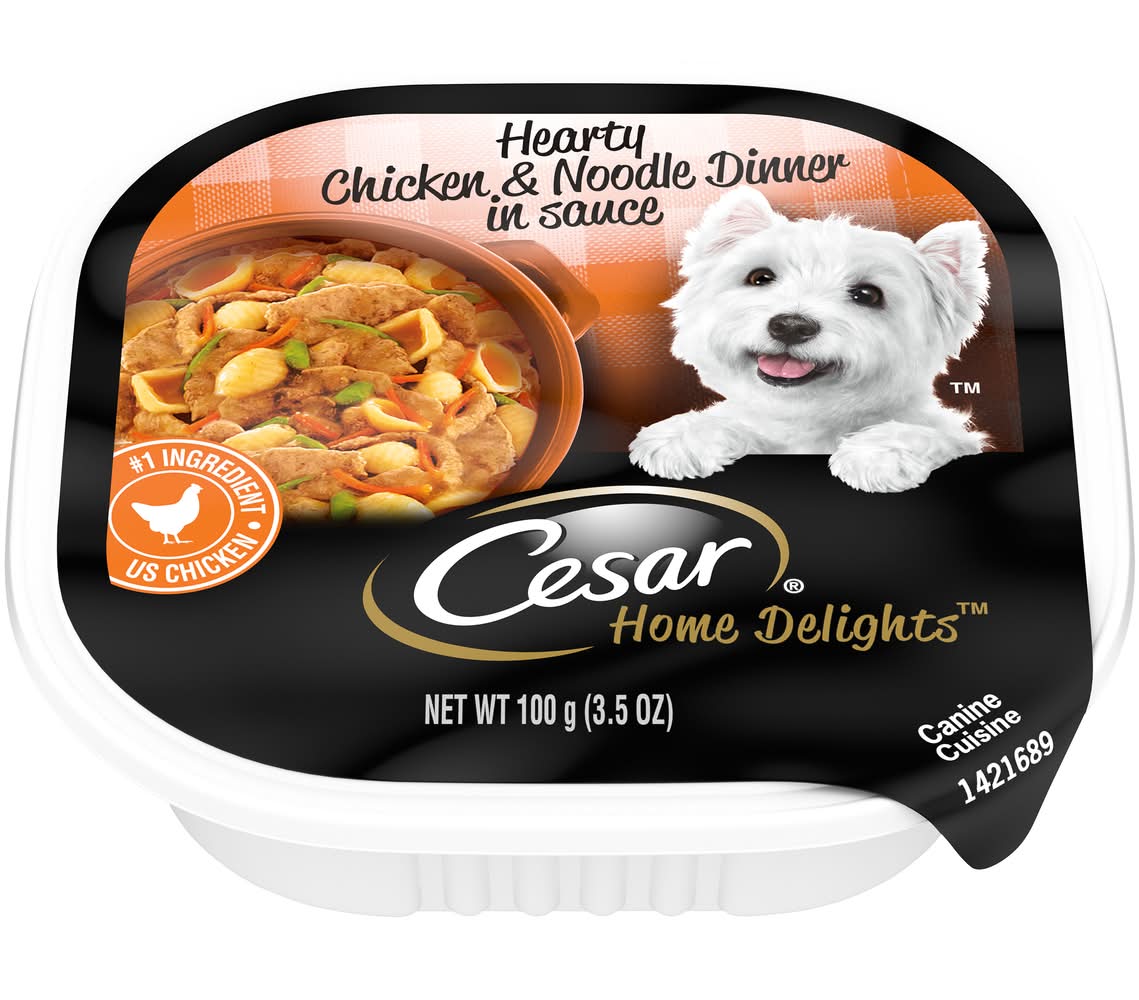 Cesar Home Delights Hearty Chicken & Noodle Dinner in sauce is formulated to meet the nutritional levels established by the AAFCO Dog Food Nutrient Profiles for Maintenance. Mars Petcare, Franklin, TN, 37068-3006, Ph: 800-525-5273