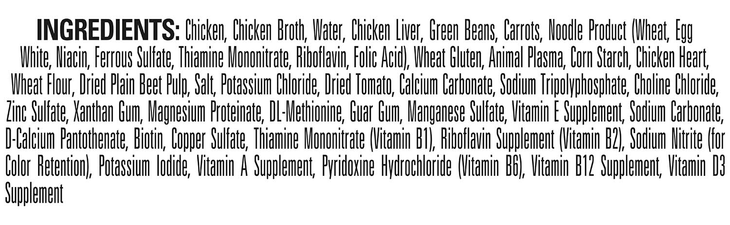 Ingredients: Chicken, Chicken Broth, Water, Chicken Liver, Green Beans, Carrots, Noodle Product (Wheat, Egg White, Niacin, Ferrous Sulfate, Thiamine Mononitrate, Riboflavin, Folic Acid), Wheat Gluten, Animal Plasma, Corn Starch, Chicken Heart, Wheat Flour, Dried Plain Beet Pulp, Salt Potassium Chloride, Dried Tomato, Calcium Carbonate, Sodium Tripolyphosphate, Choline Chloride, Zinc Sulfate, Xanthan Gum, Magnesium Proteinate, DL-Methionine, Guar Gum, Manganese Sulfate, Vitamin E Supplement, Sodium Carbonate, D-Calcium Pantothenate, Biotin, Copper Sulfate, Thiamine Mononitrate (Vitamin B1), Riboflavin Supplement (Vitamin B2), Sodium Nitrite (for Color Retention), Potassium Iodide, Vitamin A Supplement, Pyridoxine Hydrochloride (Vitamin B6), Vitamin B12 Supplement, Vitamin D3 Supplement. Chicken, Chicken Broth, Water, Chicken Liver, Green Beans, Carrots, Noodle Product (Wheat, Egg White, Niacin, Ferrous Sulfate, Thiamine Mononitrate, Riboflavin, Folic Acid), Wheat Gluten, Animal Plasma, Corn Starch, Chicken Heart, Wheat Flour, Dried Plain Beet Pulp, Salt, Potassium Chloride, Dried Tomato, Calcium Carbonate, Sodium Tripolyphosphate, Choline Chloride, Zinc Sulfate, Xanthan Gum, Magnesium Proteinate, DL-Methionine, Guar Gum, Manganese Sulfate, Vitamin E Supplement, Sodium Carbonate, D-Calcium Pantothenate, Biotin, Copper Sulfate, Thiamine Mononitrate (Vitamin B1), Riboflavin Supplement (Vitamin B2), Sodium Nitrite (for Color Retention), Potassium Iodide, Vitamin A Supplement, Pyridoxine Hydrochloride (Vitamin B6), Vitamin B12 Supplement, Vitamin D3 Supplement Contains: Wheat, Eggs, Gluten