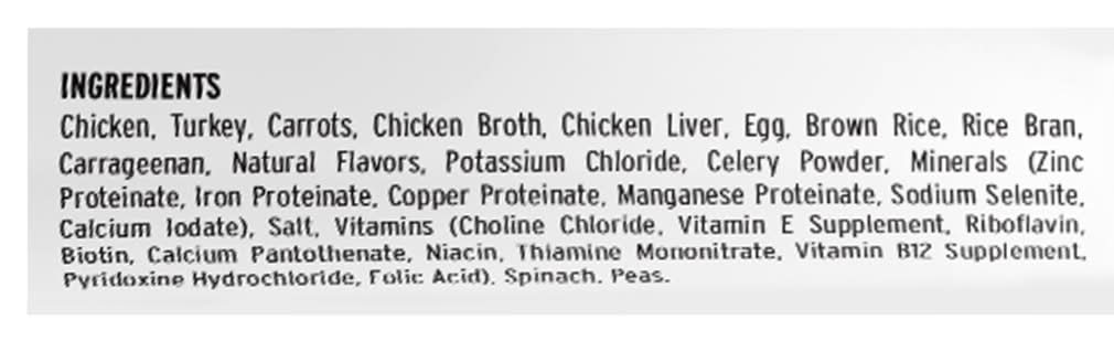 Ingredients: Chicken, Turkey, Chicken Liver, Carrots, Chicken Broth, Egg, Brown Rice, Rice Bran, Carrageenan, Natural Flavors, Potassium Chloride, Celery Powder, Minerals (Zinc Proteinate, Iron Proteinate, Copper Proteinate, Manganese Proteinate, Sodium Selenite, Calcium Iodate), Salt, Vitamins (Choline Chloride, Vitamin E Supplement, Niacin, Calcium Pantothenate, Biotin, Thiamine Mononitrate, Riboflavin, Vitamin B12 Supplement, Pyridoxine Hydrochloride, Folic Acid), Peas, Spinach. Contains: Eggs, Celery