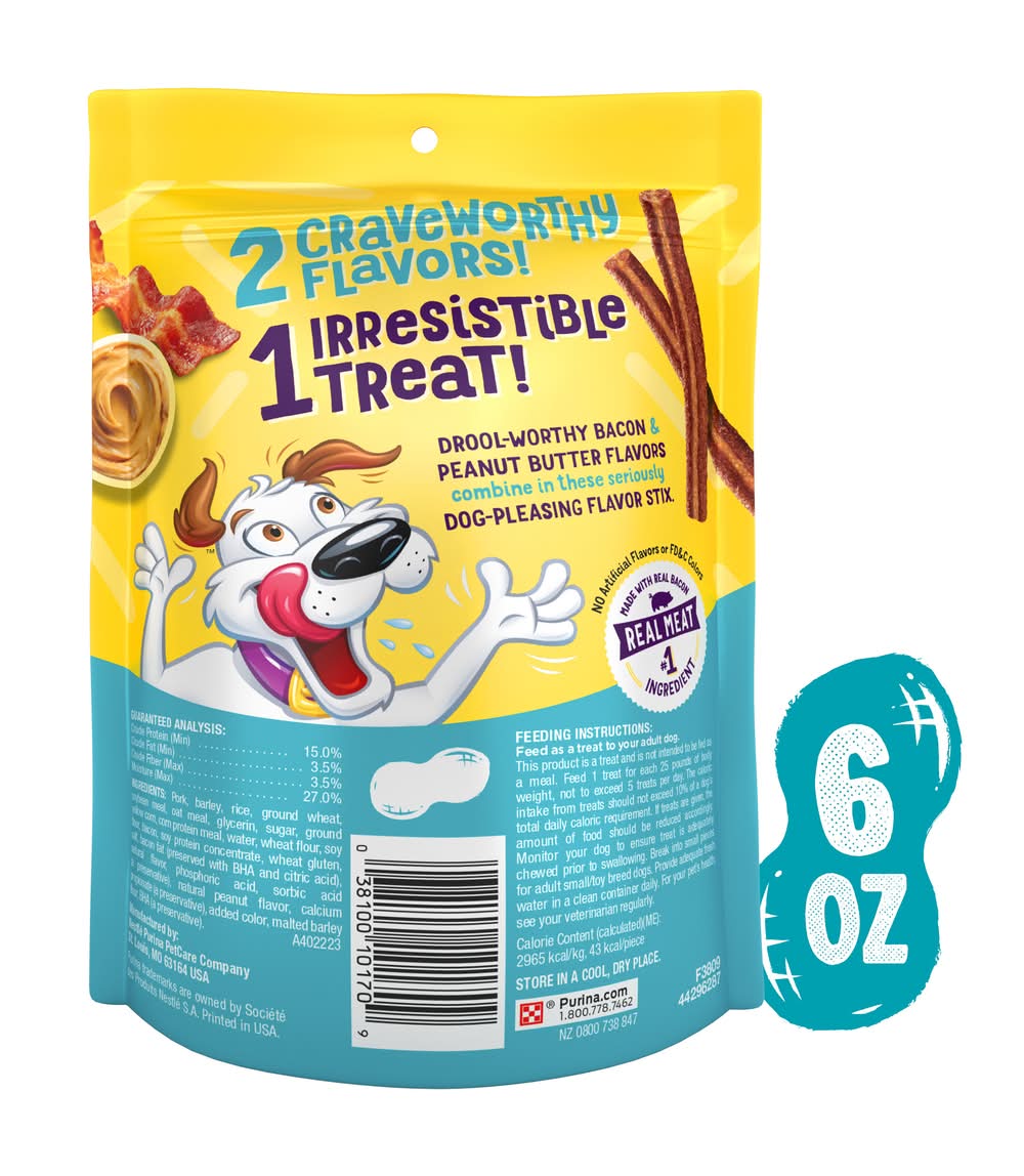 Introduce your lovable canine companion to the ultimate treating experience with Purina Beggin’ Flavor Stix With Bacon and Peanut Butter Flavor dog treats. With meat as the number one ingredient, these dog chews deliver unmatched fun and excitement, making treat time an extra-special bonding experience. Each of these delicious, meaty, soft dog treats is made with bacon and the yummy taste of peanut butter for a flavor combo that will drive dogs bonkers. 2 craveworthy flavors – 1 irresistible treat. These treats can be fed whole as large dog treats or broken into bite-sized small or mini dog treats to accommodate dogs and appetites of all sizes. You can feel good knowing these dog snacks are made with no artificial flavors or FD and C colors and are proudly crafted in US facilities. Your dog deserves a treat he’ll go bonkers over every time, so make sure you keep your pantry stocked with Purina Beggin’ Flavor Stix With Bacon and Peanut Butter Flavor dog treats.