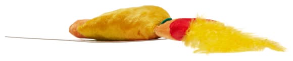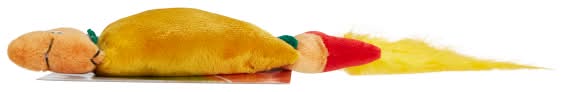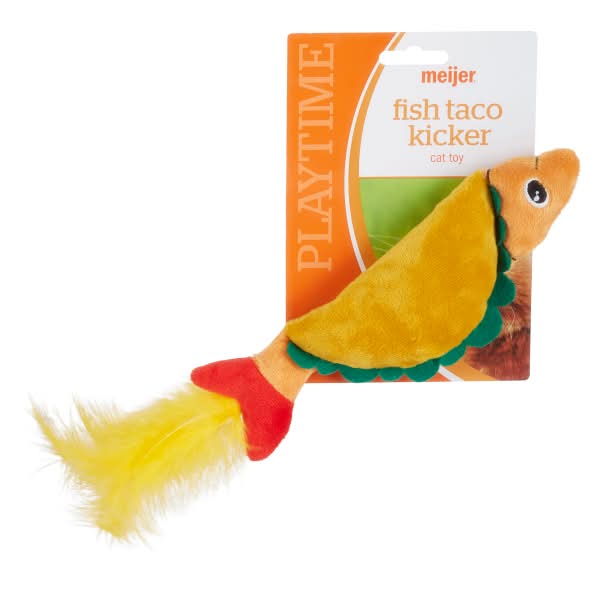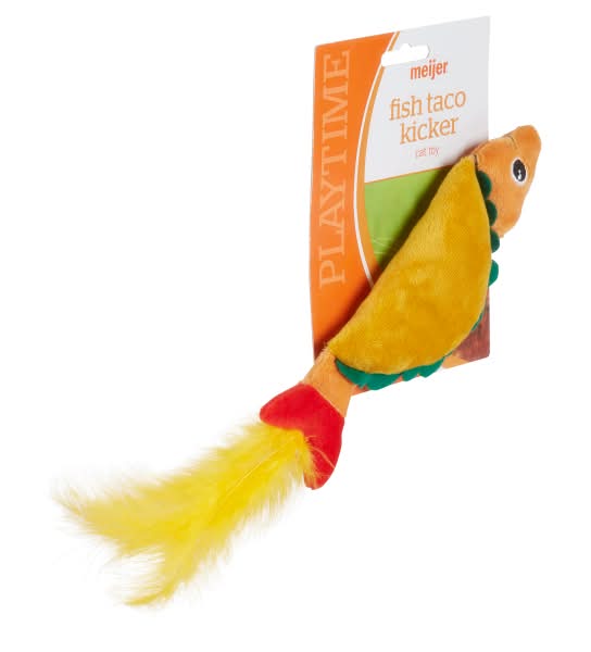 Meijer Fish Taco Kicker Cat Toy is designed to resemble a fish inside a taco and includes a feather tail, catering to a cat's natural instinct to hunt. It is intended to entertain cats and is suitable for tossing to encourage chasing activities.