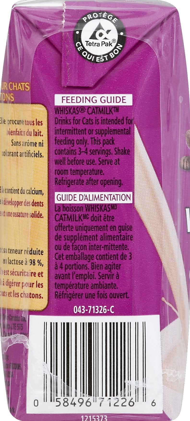 Directions: feeding guide: whiskas catmilk drink for cats is intended for intermittent or supplemental feeding only. this pack contains 3-4 servings. shake well before use. serve at room temperature. refrigerate after opening. shake well before opening.