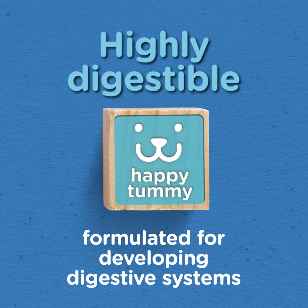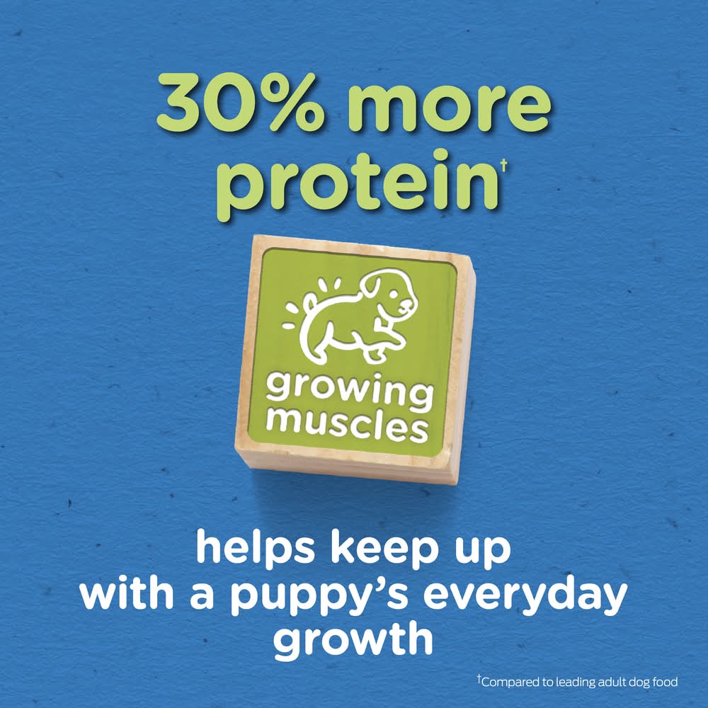 This high protein dry puppy food contains 100 percent of the essential nutrients puppies require to grow big and strong, and the delicious taste gives him a reason to clean his bowl at every feeding. Tend to your growing pup's nutritional needs through the vital early stages of his development with this dry puppy dog food, and take comfort in knowing he's getting a highly digestible dog kibble formula he's sure to look forward to every day. Packed with 30 percent more protein than the leading adult dog food, this dog food kibble supports your puppy’s growing muscles so he can keep up with his adventurous canine pursuits. So dish up a serving of this Purina Puppy Chow dog food, and let him know you care about his health and happiness. Purina Puppy Chow Complete high protein puppy food provides the Building Blocks of puppy nutrition to help lay the foundation for a healthy, active life. The Healthy Start blend provides high-quality protein, including with real, American-raised chicken, DHA for brain and vision development, antioxidants like vitamin C and 100 percent of the essential nutrients for your puppy’s first year.
