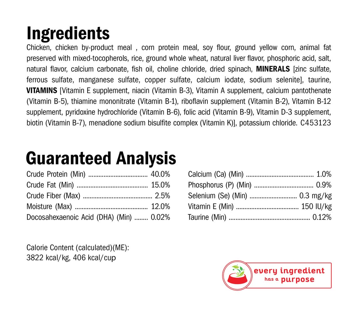 Ingredients: Chicken, Chicken By-Product Meal, Corn Protein Meal, Soy Flour, Ground Yellow Corn, Animal Fat Preserved With Mixed-Tocopherols, Rice, Ground Whole Wheat, Natural Liver Flavor, Phosphoric Acid, Salt, Natural Flavor, Calcium Carbonate, Fish Oil, Choline Chloride, Dried Spinach, MINERALS [Zinc Sulfate, Ferrous Sulfate, Manganese Sulfate, Copper Sulfate, Calcium Iodate, Sodium Selenite], Taurine, VITAMINS [Vitamin E Supplement, Niacin (Vitamin B-3), Vitamin A Supplement, Calcium Pantothenate (Vitamin B-5), Thiamine Mononitrate (Vitamin B-1), Riboflavin Supplement (Vitamin B-2), Vitamin B-12 Supplement, Pyridoxine Hydrochloride (Vitamin B-6), Folic Acid (Vitamin B-9), Vitamin D-3 Supplement, Biotin (Vitamin B-7), Menadione Sodium Bisulfite Complex (Vitamin K)], Potassium Chloride. C453123