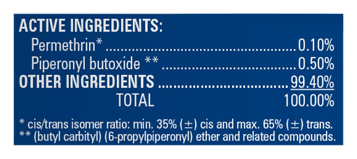 Ingredients: Active Ingredients: Permethrin (Cis/Trans Isomer Ratio: Min, 35% (+) Cis and Max, 65% (+) Trans) - 0.10%, Piperonyl Butoxide ((Butyl Carbityl) (6-Propylpiperonyl) Ether and Related Compounds) - 0.50%, Other Ingredients: - 99.40%, Total - 100.00%