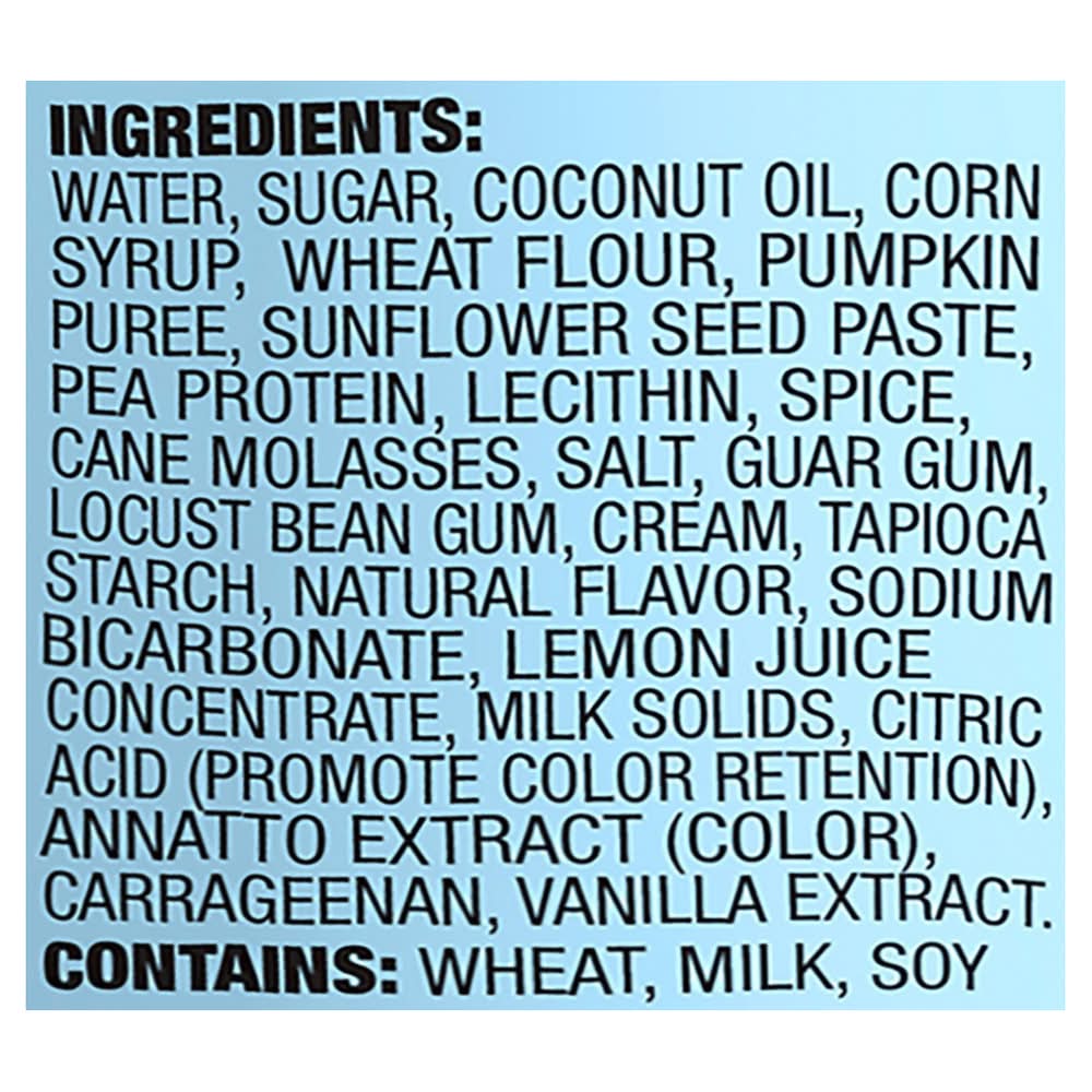 Ingredients: Water, Sugar, Coconut Oil, Corn Syrup, Pumpkin Puree, Sunflower Seed Paste, Pea Protein, Lecithin, Spice, Cane Molasses, Salt, Guar Gum, Locust Bean Gum, Cream, Tapioca Starch, Natural Flavor, Sodium Bicarbonate, Lemon Juice Concentrate, Milk Solids, Citric Acid (Promote Color Retention), Annatto Extract (Color), Carrageenan, Vanilla Extract Contains: wheat, milk, soy, Tree Nuts