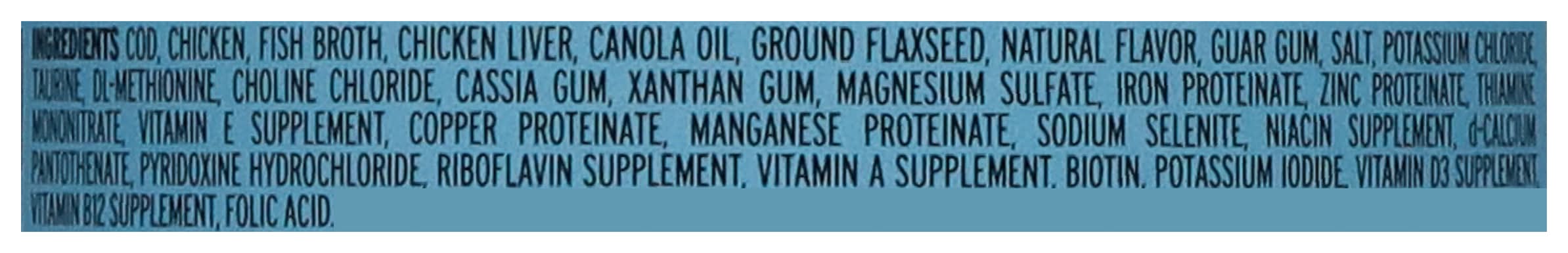 Ingredients: Cod, Chicken, Fish Broth, Chicken Liver, Canola Oil, Ground Flaxseed, Natural Flavor, Guar Gum, Salt, Potassium Chloride, Taurine, DL-Methionine, Choline Chloride, Cassia Gum, Xanthan Gum, Magnesium Sulfate, Iron Proteinate, Zinc Proteinate, Thiamine Mononitrate, Vitamin E Supplement, Copper Proteinate, Manganese Proteinate, Sodium Selenite, Niacin Supplement, D-Calcium Pantothenate, Pyridoxine Hydrochloride, Riboflavin Supplement, Vitamin A Supplement, Biotin, Potassium Iodide, Vitamin D3 Supplement Vitamin B12 Supplement, Folic Acid Contains: Fish, Cod, Fish