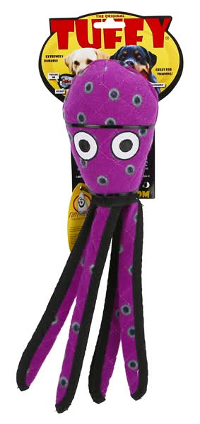 Tuffy Ocean Creature Squid Purple is a soft dog toy featuring three layers, including fleece and industrial-grade luggage material, topped with a plastic coating for enhanced durability. It is specifically designed for interactive play with dogs but is not intended for chewing. To ensure safety, supervision is recommended during play to prevent any part of the toy from being ingested by the dog.