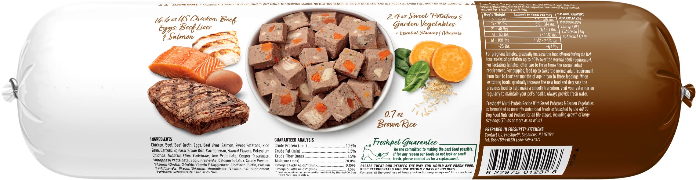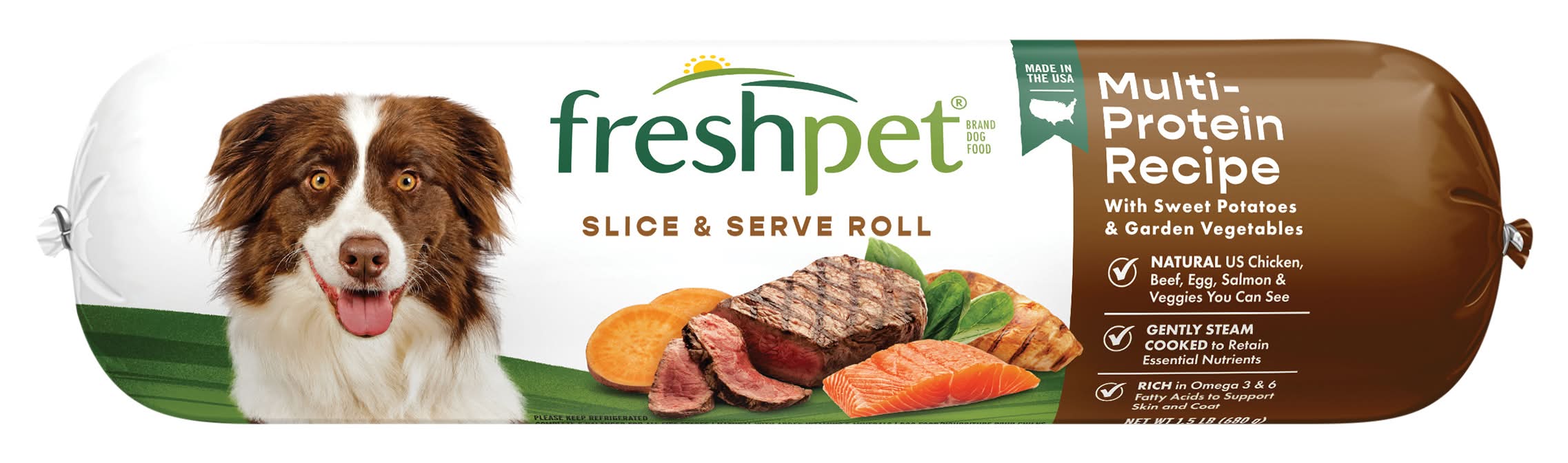 Chicken, beef, egg & salmon recipe with sweet potatoes & garden vegetables. Rich in Omega 3 & 6 fatty acids to support healthy skin & coat. Fresh, real food from the fridge. Natural chicken, beef & salmon. No meat meals or by-product meals. Complete & balanced for all life stages. At Freshpet, we believe dogs and cats deserve real, nourishing food, like the fresh food we enjoy. We gently steam our simple, healthy ingredients to retain their natural goodness and provide the essential nutrients dogs and cats need to lead their happiest, most tail-wagging lives. Freshpet Select is ready to serve, simply cut using the serving marks. No heating required. Cover open end and refrigerate. Avoid freezing for best results. This 1.5 lb package of Freshpet Select is made with: 3.6 oz of chicken, beef, beef liver & salmon; 2 oz Sweet potatoes & garden vegetables + essential vitamins & minerals; 2 eggs. Freshpet Guarantee: We are committed to making the best food possible. If for any reason our foods do not look or smell fresh, please contact us for a replacement. freshpet.com Prepared in Freshpet Kitchens: Contact Us: Freshpet, PO Box 2157, Secaucus, NJ