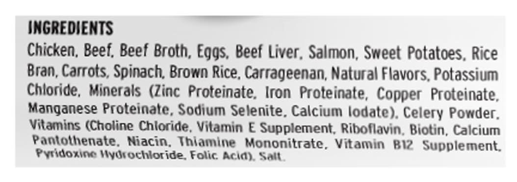 Ingredients: Chicken, Beef, Beef Broth, Eggs, Beef Liver, Salmon, Sweet Potatoes, Rice Bran, Carrots, Spinach, Brown Rice, Carrageenan, Natural Flavors, Potassium Chloride, Minerals (Zinc Proteinate, Iron Proteinate, Copper Proteinate, Manganese Proteinate, Sodium Selenite, Calcium Iodate), Celery Powder, Vitamins (Choline Chloride, Vitamin E Supplement, Riboflavin, Biotin, Calcium Pantothenate, Niacin, Thiamine Mononitrate, Vitamin B12 Supplement, Pyridoxine Hydrochloride, Folic Acid), Salt
