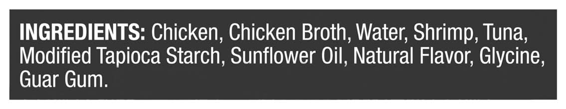 Ingredients: Chicken, Chicken Broth, Water, Shrimp, Tuna, Modified Tapioca Starch, Sunflower Oil, Natural Flavor, Glycine, Guar Gum Contains: Crustacean Shellfish, Shrimp, Fish, Tuna