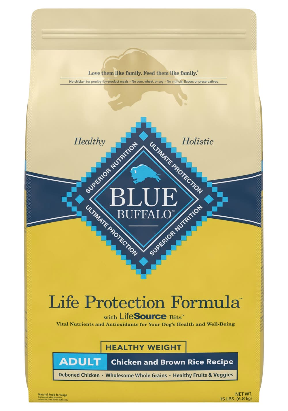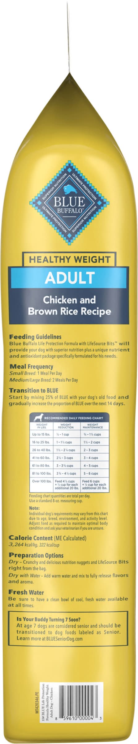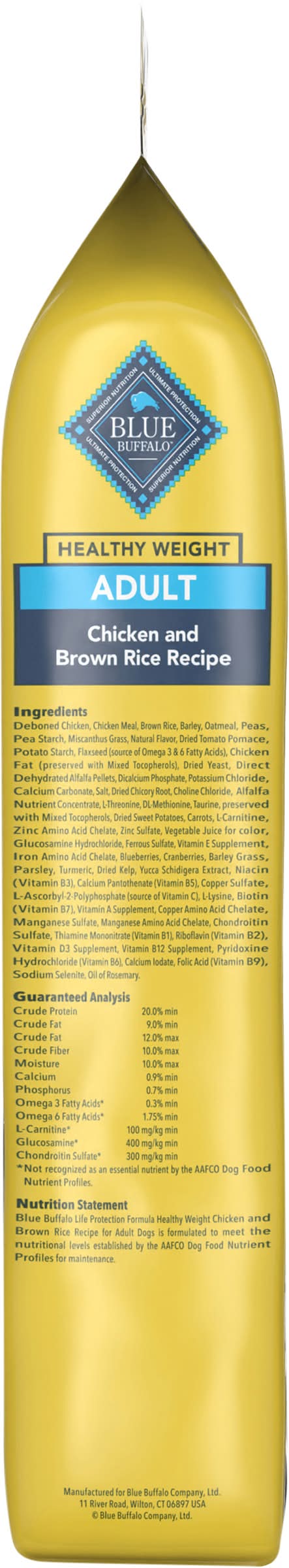 With LifeSource Bits The Finest Healthy Ingredients All Blue formulas are made with natural ingredients, enhanced with vitamins, minerals and other nutrients. Each recipe has just the right balance of high-quality protein, whole grains, fruits and vegetables in every bite. A source of high-quality protein, Wholesome Whole Grains Brown rice, barley and oatmeal, Healthy Fruits & Veggies, Carrots, blueberries and cranberries. Antioxidant-Rich LifeSource Bits Blue's exclusive LifeSource Bits are a precise blend of antioxidants, vitamins and minerals selected by veterinarians and animal nutritionists to help support: • Immune system health • Life stage requirements • Healthy oxidative balance And LifeSource Bits are cold-formed to help maintain the potency of their ingredients by minimizing their exposure to heat during processing. Blue Healthy Weight Adult Dog Chicken & Brown Rice Recipe Benefits, Lean Muscle Development, High-quality protein from deboned chicken and chicken meal, plus l-carnitine help develop and maintain lean muscles. Formulated to provide a fully satisfying meal without an excessive amount of calories from fat. 30% reduction in fat compared to Blue LPF Adult Chicken Recipe. Strong Bones & Teeth. A precise blend of calcium, phosphorus and essential vitamins helps promote strong bones and teeth. Joint Health. Glucosamine and chondroitin help support joint function and overall mobility, Healthy Skin & Coat. An optimal balance of omega 3 & 6 fatty acids helps promote a shiny coat and healthy skin. Immune System Health, Essential vitamins, chelated minerals and important antioxidants help support the immune system. Blue Life Protection Formula with LifeSource Bits Healthy Weight Chicken and Brown Rice Recipe for Adult Dogs is formulated to meet the nutritional levels established by the AAFCO Dog Food Nutrient Profiles for maintenance. • Size: Adult • Blue Buffalo Company, Ltd., 11 River Road, Wilton, CT, 06897