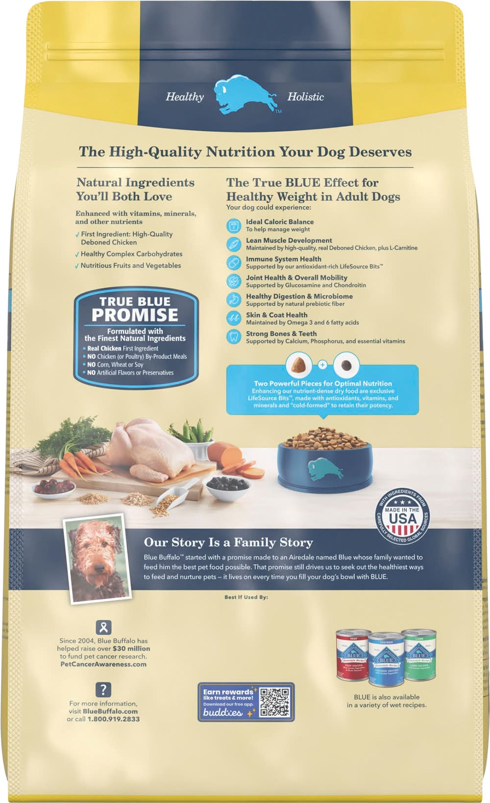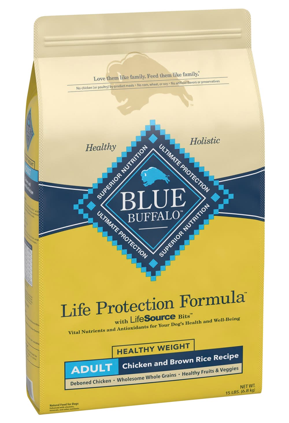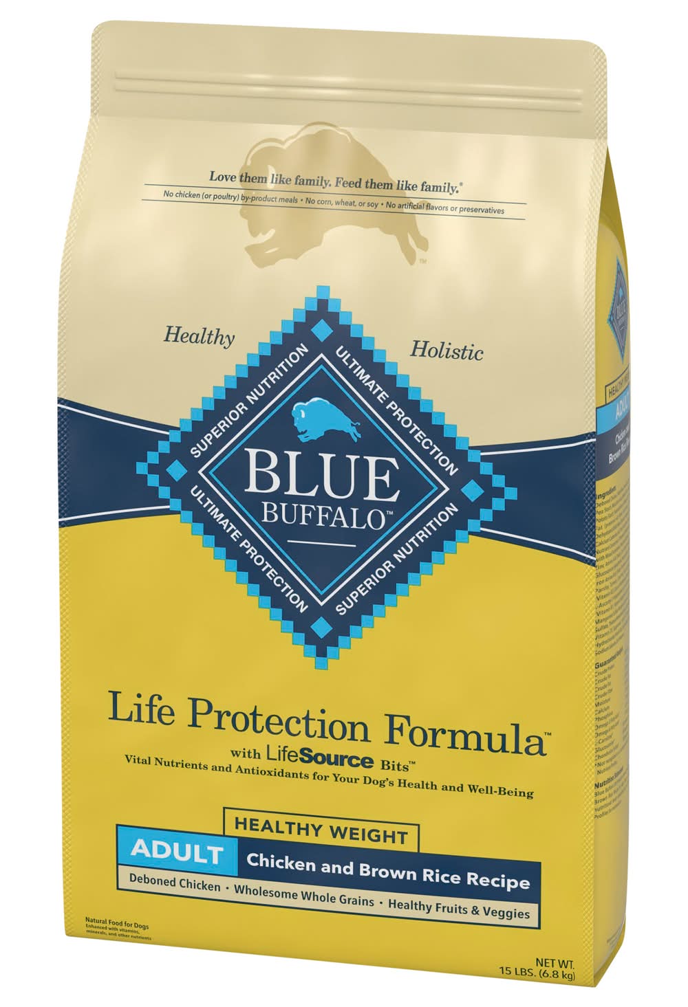 With LifeSource Bits The Finest Healthy Ingredients All Blue formulas are made with natural ingredients, enhanced with vitamins, minerals and other nutrients. Each recipe has just the right balance of high-quality protein, whole grains, fruits and vegetables in every bite. A source of high-quality protein, Wholesome Whole Grains Brown rice, barley and oatmeal, Healthy Fruits & Veggies, Carrots, blueberries and cranberries. Antioxidant-Rich LifeSource Bits Blue's exclusive LifeSource Bits are a precise blend of antioxidants, vitamins and minerals selected by veterinarians and animal nutritionists to help support: • Immune system health • Life stage requirements • Healthy oxidative balance And LifeSource Bits are cold-formed to help maintain the potency of their ingredients by minimizing their exposure to heat during processing. Blue Healthy Weight Adult Dog Chicken & Brown Rice Recipe Benefits, Lean Muscle Development, High-quality protein from deboned chicken and chicken meal, plus l-carnitine help develop and maintain lean muscles. Formulated to provide a fully satisfying meal without an excessive amount of calories from fat. 30% reduction in fat compared to Blue LPF Adult Chicken Recipe. Strong Bones & Teeth. A precise blend of calcium, phosphorus and essential vitamins helps promote strong bones and teeth. Joint Health. Glucosamine and chondroitin help support joint function and overall mobility, Healthy Skin & Coat. An optimal balance of omega 3 & 6 fatty acids helps promote a shiny coat and healthy skin. Immune System Health, Essential vitamins, chelated minerals and important antioxidants help support the immune system. Blue Life Protection Formula with LifeSource Bits Healthy Weight Chicken and Brown Rice Recipe for Adult Dogs is formulated to meet the nutritional levels established by the AAFCO Dog Food Nutrient Profiles for maintenance. • Size: Adult • Blue Buffalo Company, Ltd., 11 River Road, Wilton, CT, 06897
