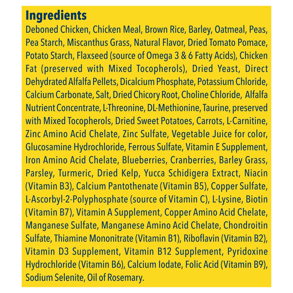 Ingredients: Deboned Chicken, Chicken Meal, Brown Rice, Barley, Oatmeal, Peas, Pea Starch, Miscanthus Grass, Natural Flavor, Dried Tomato Pomace, Potato Starch, Flaxseed (Source of Omega 3 & 6 Fatty Acids), Chicken Fat (Preserved with Mixed Tocopherols), Dried Yeast, Direct Dehydrated Alfalfa Pellets, Dicalcium Phosphate, Potassium Chloride, Calcium Carbonate, Salt, Dried Chicory Root, Choline Chloride, Alfalfa Nutrient Concentrate, L-Threonine, DL-Methionine, Taurine, Preserved with Mixed Tocopherols, Dried Sweet Potatoes, Carrots, L-Carnitine, Zinc Amino Acid Chelate, Zinc Sulfate, Vegetable Juice for Color, Glucosamine Hydrochloride, Ferrous Sulfate, Vitamin E Supplement, Iron Amino Acid Chelate, Blueberries, Cranberries, Barley Grass, Parsley, Turmeric, Dried Kelp, Yucca Schidigera Extract, Niacin (Vitamin B3), Calcium Pantothenate (Vitamin B5), Copper Sulfate, L-Ascorbyl-2-Polyphosphate (Source of Vitamin C), L-Lysine, Biotin (Vitamin B7), Vitamin A Supplement, Copper Amino Acid Chelate, Manganese Sulfate, Manganese Amino Acid Chelate, Chondroitin Sulfate, Thiamine Mononitrate (Vitamin B1), Riboflavin (Vitamin B2), Vitamin D3 Supplement, Vitamin B12 Supplement, Pyridoxine Hydrochloride (Vitamin B6), Calcium Iodate, Folic Acid (Vitamin B9), Sodium Selenite, Oil of Rosemary Contains: Barley, Oat