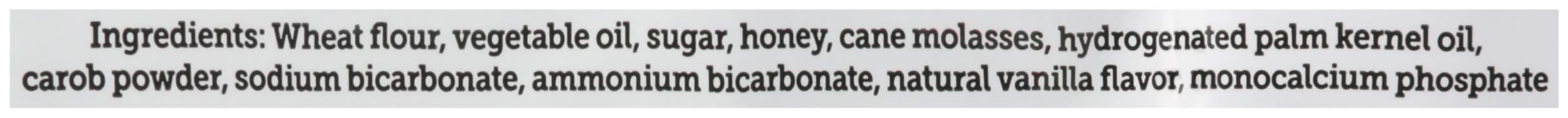 Ingredients: Wheat Flour, Vegetable Oil, Sugar, Honey, Cane Molasses, Hydrogenated Palm Kernel Oil, Carob Powder, Sodium Bicarbonate, Ammonium Bicarbonate, Natural Vanilla Flavor, Monocalcium Phosphate Contains: Wheat