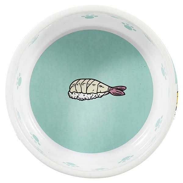 Give your pet a stylish design with dinner, with the sushi shallow pet bowl. It features colorful sushi drawings around the exterior and a sushi logo in the basin. The basin is solid teal and teal paw prints are scattered around the interior sides of the bowl.