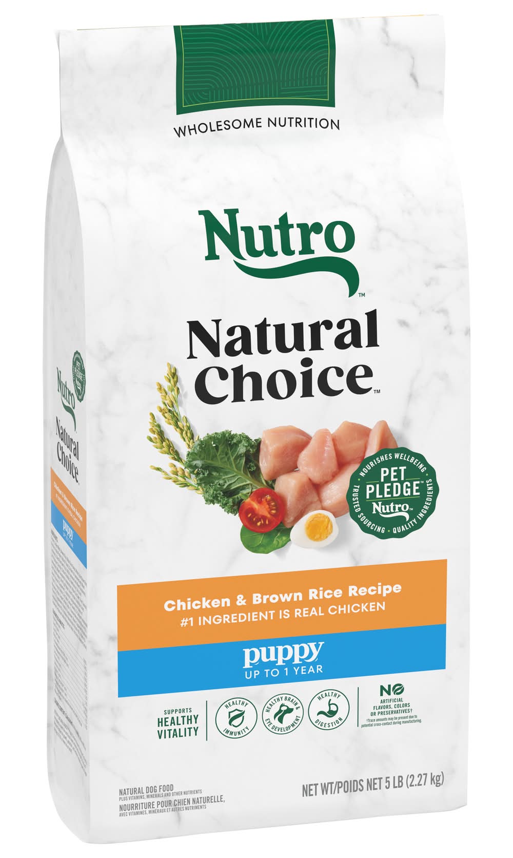 Feeding guidelines: adjust food to maintain ideal body weight. always provide fresh drinking water. puppies up to 6 months: feed suggested daily amount in 3-4 meals per day. puppies 6 months to adult: feed in 2-3 meals per day. gestation/lactation: during gestation, feed up to 2 times the amount shown for puppies 6 to 9 months. feed lactating females as much food as they will eat to maintain weight. amounts will differ depending on litter size. every cup of our food is nutrient dense so your dog gets the right amount of calories in a complete and nutritious meal. to help maintain freshness, seal bag tightly and store in a cool, dry location. suggested amount to feed per day (cups) (use a standard 8 oz. measuring cup which holds 3.69 oz. nutro natural choice puppy chicken & brown rice recipe dog food): weight of dog: 3 lb; weaning to 3 months: 3/4 cup; 3 to 6 months: 2/3 cup; 6 to 9 months: 1/2 cup. 9 to 12 months: transition to adult. weight of dog: 5 lb; weaning to 3 months: 1-1/4 cups; 3 to 6 months: 1 cup; 6 to 9 months: 3/4 cup. 9 to 12 months: transition to adult. weight of dog: 10 lb; weaning to 3 months: 2 cups; 3 to 6 months: 1-2/3 cups; 6 to 9 months: 1-1/3 cups. 9 to 12 months: transition to adult. weight of dog: 15 lb; weaning to 3 months: 2-2/3 cups; 3 to 6 months: 2-1/4 cups; 6 to 9 months: 2 cups. 9 to 12 months: 1-1/2 cups. weight of dog: 20 lb; weaning to 3 months: 3-1/4 cups; 3 to 6 months: 2-3/4 cups; 6 to 9 months: 2-1/3 cups. 9 to 12 months: 2 cups. weight of dog: 30 lb; weaning to 3 months: 4-1/3 cups; 3 to 6 months: 3-3/4 cups; 6 to 9 months: 3-1/4 cups. 9 to 12 months: 2-2/3 cups. weight of dog: 40 lb; weaning to 3 months: 5-1/3 cups; 3 to 6 months: 4-2/3 cups; 6 to 9 months: 4 cups. 9 to 12 months: 3-1/4 cups. weight of dog: 50 lb; weaning to 3 months: 6-1/3 cups; 3 to 6 months: 5-1/2 cups; 6 to 9 months: 4-3/4 cups. 9 to 12 months: 4. weight of dog: 60 lb; 3 to 6 months: 6-1/3 cups; 6 to 9 months: 5-1/3 cups. 9 to 12 months: 4-1/2. transitioning to our food: if switching to this recipe or feeding nutro dog food for the first time, we suggest you blend increasing amounts of the new recipe with your old food for six days.