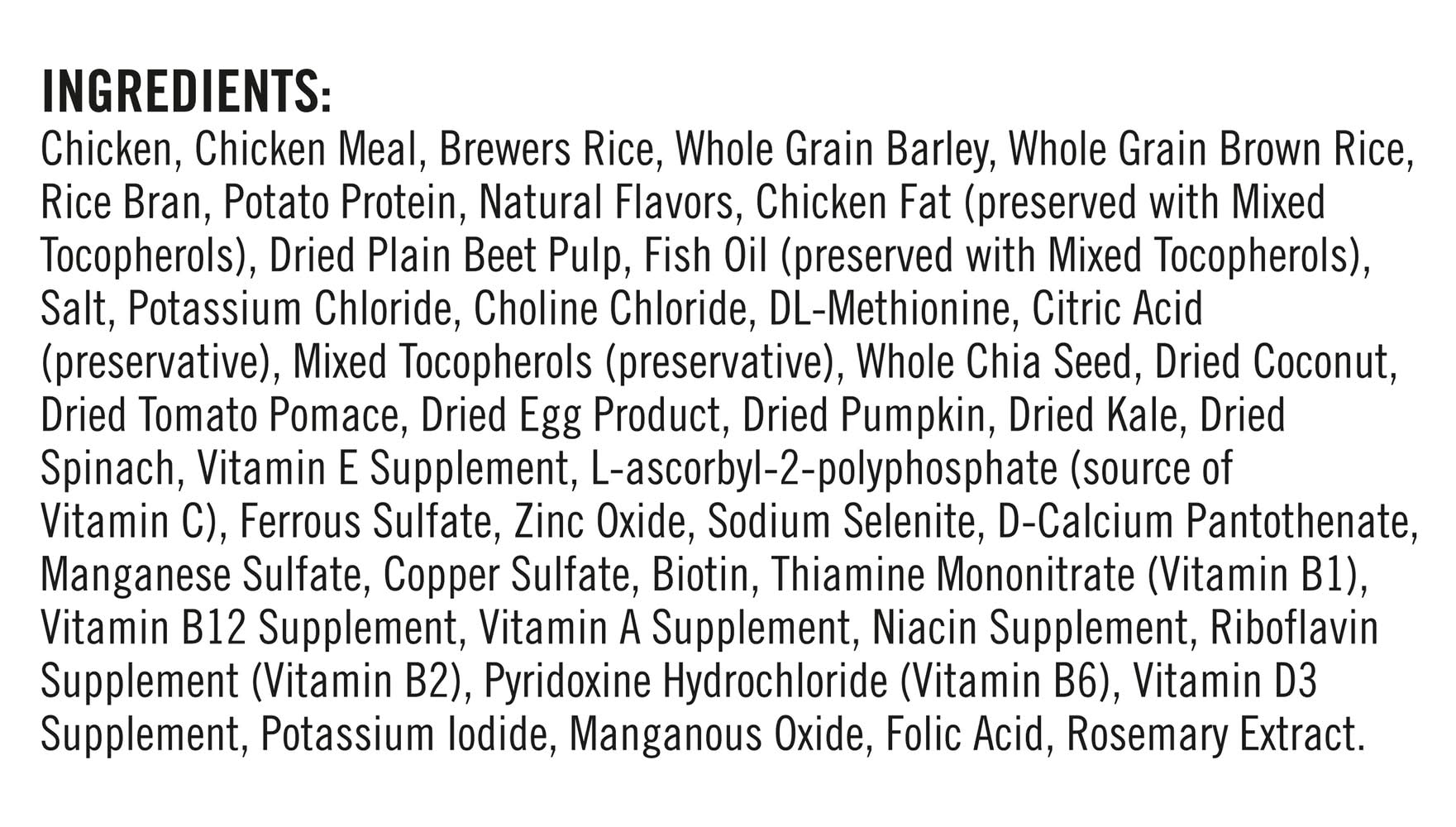 Ingredients: Chicken, Chicken Meal, Brewers Rice, Whole Grain Barley, Whole Grain Brown Rice, Rice Bran, Potato Protein, Natural Flavors, Chicken Fat (Preserved with Mixed Tocopherols), Dried Plain Beet Pulp, Fish Oil (Preserved with Mixed Tocopherols), Salt, Potassium Chloride, Choline Chloride, DL-Methionine, Citric Acid (Preservative), Mixed Tocopherols (Preservative), Whole Chia Seed, Dried Coconut, Dried Tomato Pomace, Dried Egg Product, Dried Pumpkin, Dried Kale, Dried Spinach, Vitamin E Supplement, L-Ascorbyl-2-Polyphosphate (Source of Vitamin C), Ferrous Sulfate, Zinc Oxide, Sodium Selenite, D-Calcium Pantothenate, Manganese Sulfate, Copper Sulfate, Biotin, Thiamine Mononitrate (Vitamin B1), Vitamin B12 Supplement, Vitamin A Supplement, Niacin Supplement, Riboflavin Supplement (Vitamin B2), Pyridoxine Hydrochloride (Vitamin B6), Vitamin D3 Supplement, Potassium Iodide, Manganous Oxide, Folic Acid, Rosemary Extract Contains: Barley, Fish, Tree Nuts, Coconuts, Eggs
