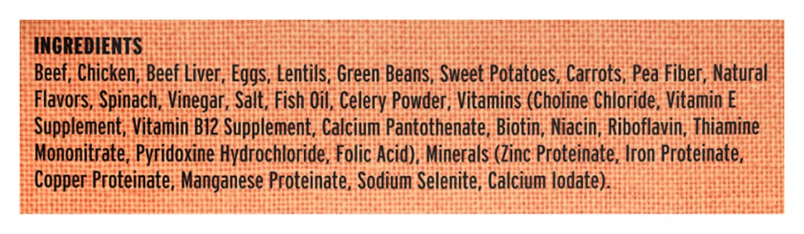 Ingredients: Beef, Chicken, Beef Liver, Eggs, Lentils, Green Beans, Sweet Potatoes, Carrots, Pea Fiber, Natural Flavors, Spinach, Vinegar, Salt, Fish Oil, Celery Powder, Vitamins (Choline Chloride Vitamin E Supplement Vitamin B12 Supplement Calcium Pantothenate Biotin Niacin Riboflavin Thiamine Mononitrate Pyridoxine Hydrochloride Folic Acid), Minerals, Zinc Proteinate, Iron Proteinate, Copper Proteinate, Manganese Proteinate, Sodium Selenite, Calcium lodate Contains: Eggs, Fish, Celery