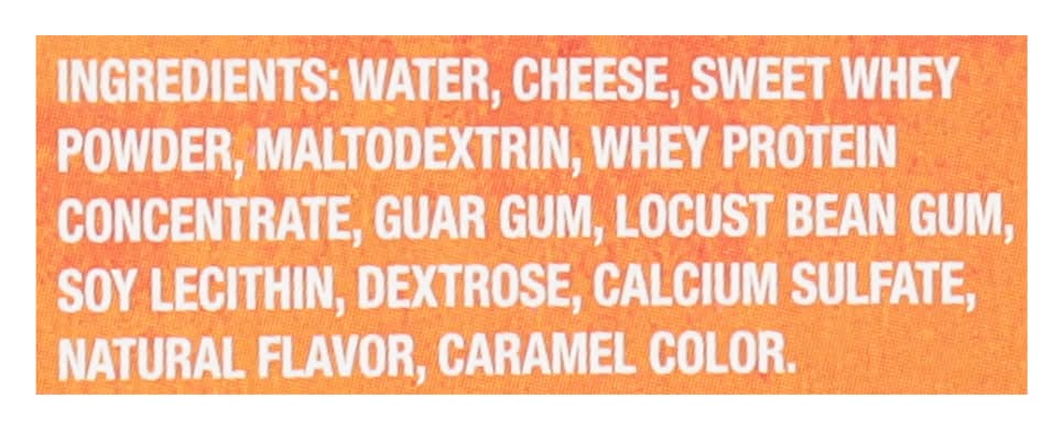 Ingredients: Water, Cheese, Sweet Whey Powder, Maltodextrin, Whey Protein Concentrate, Natural Flavor, Mono & Diglycerides, Guar Gum, Dextrose, Polysorbate 80, Carrageenan, Calcium Sulfate, Dipotassium Phosphate, Caramel Color