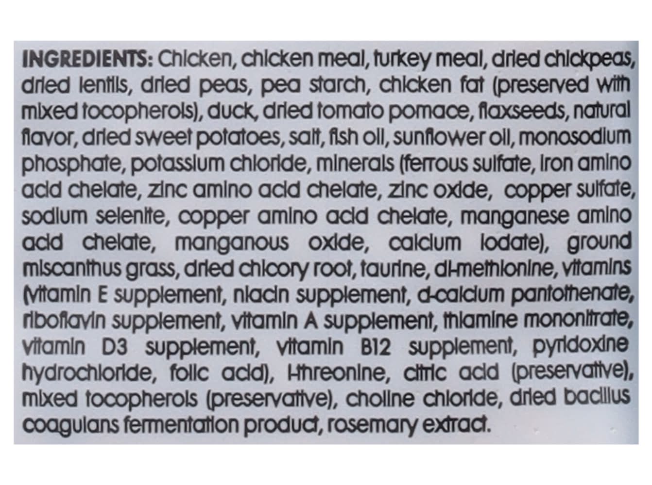 Ingredients: Chicken, Chicken Meal, Turkey Meal, Dried Chickpeas, Dried Lentils, Dried Peas, Pea Starch, Chicken Fat (Preserved with Mixed Tocopherols), Duck, Dried Tomato Pomace, Flaxseeds, Natural Flavor, Dried Sweet Potatoes, Salt, Fish Oil, Sunflower Oil, Monosodium Phosphate, Potassium Chloride, Minerals (Ferrous Sulfate, Iron Amino Acid Chelate, Zinc Amino Acid Chelate, Zinc Oxide, Copper Sulfate, Sodium Selenite, Copper Amino Acid Chelate, Manganese Amino Acid Chelate, Manganous Oxide, Calcium Iodate), Ground Miscanthus Grass, Dried Chicory Root, Taurine, DL-Methionine, Vitamins (Vitamin E Supplement, Niacin Supplement, D-Calcium Pantothenate, Riboflavin Supplement, Vitamin A Supplement, Thiamine Mononitrate, Vitamin D3 Supplement, Vitamin B12 Supplement, Pyridoxine Hydrochloride, Folic Acid), L-Threonine, Citric Acid (Preservative), Mixed Tocopherols (Preservative), Choline Chloride, Dried Bacillus Coagulans Fermentation Product, Rosemary Extract Contains: Fish