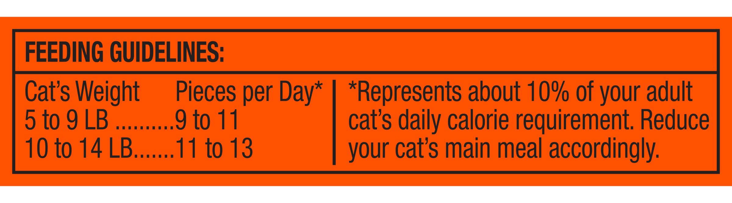 Directions: feeding instructions: cat's weight: 5 to 9 lb, 8 to 14 pieces per day (represents about 10% of your adult cat's daily calorie requirement); 10 to 14 lb, 16 to 22 pieces per day.