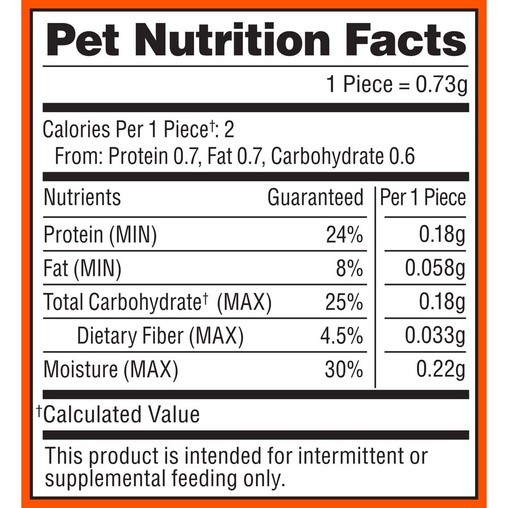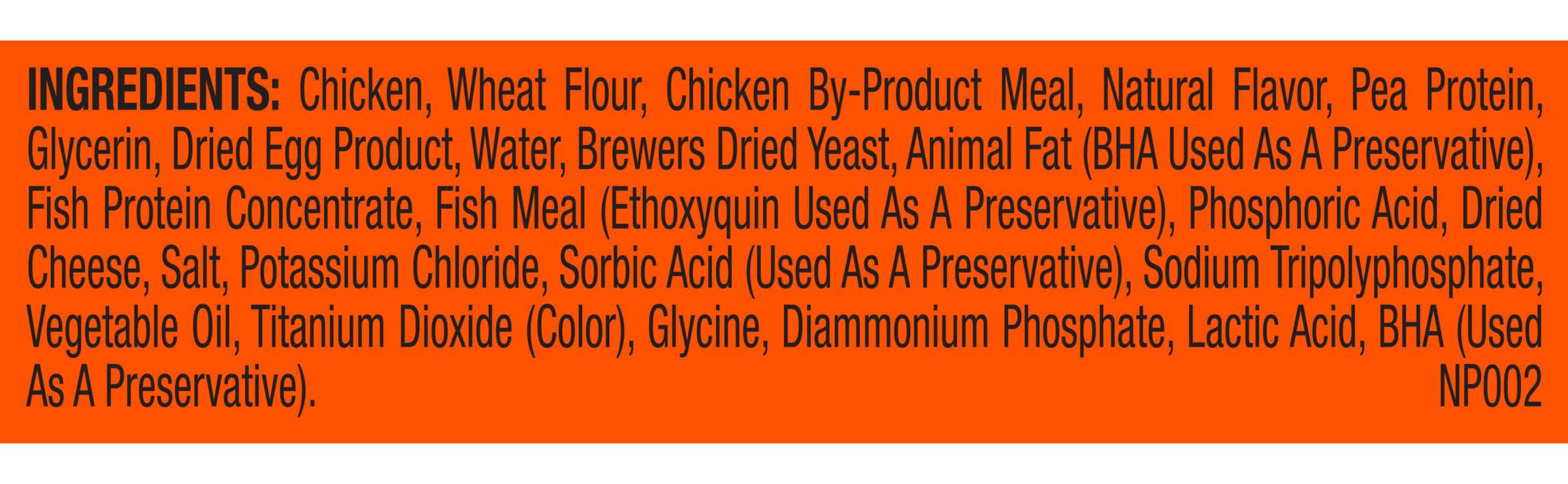 Ingredients: Chicken, Wheat Flour, Animal Digest, Chicken By-product Meal, Pea Protein, Brewers Dried Yeast, Glycerin, Chicken Breast, Dried Egg Product, Water, Animal Fat (bha Used As A Preservative), Fish Protein Concentrate, Fish Meal (preserved With Ethoxyquin), Phosphoric Acid, Dried Cheese, Salt, Potassium Chloride, Sorbic Acid (used As A Preservative), Vegetable Oil, Titanium Dioxide (color), Natural Flavor, Lactic Acid, Bha (used As A Preservative).