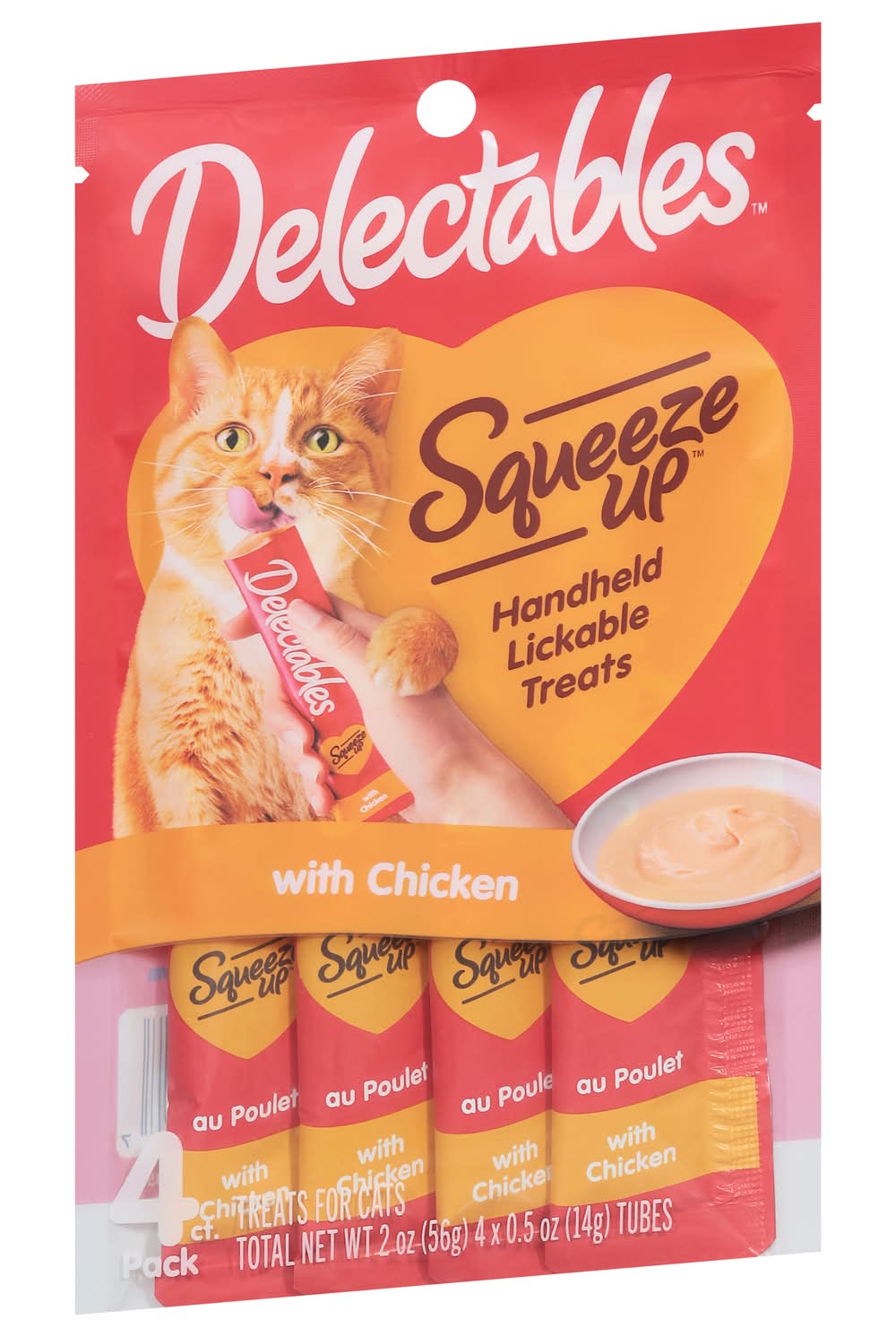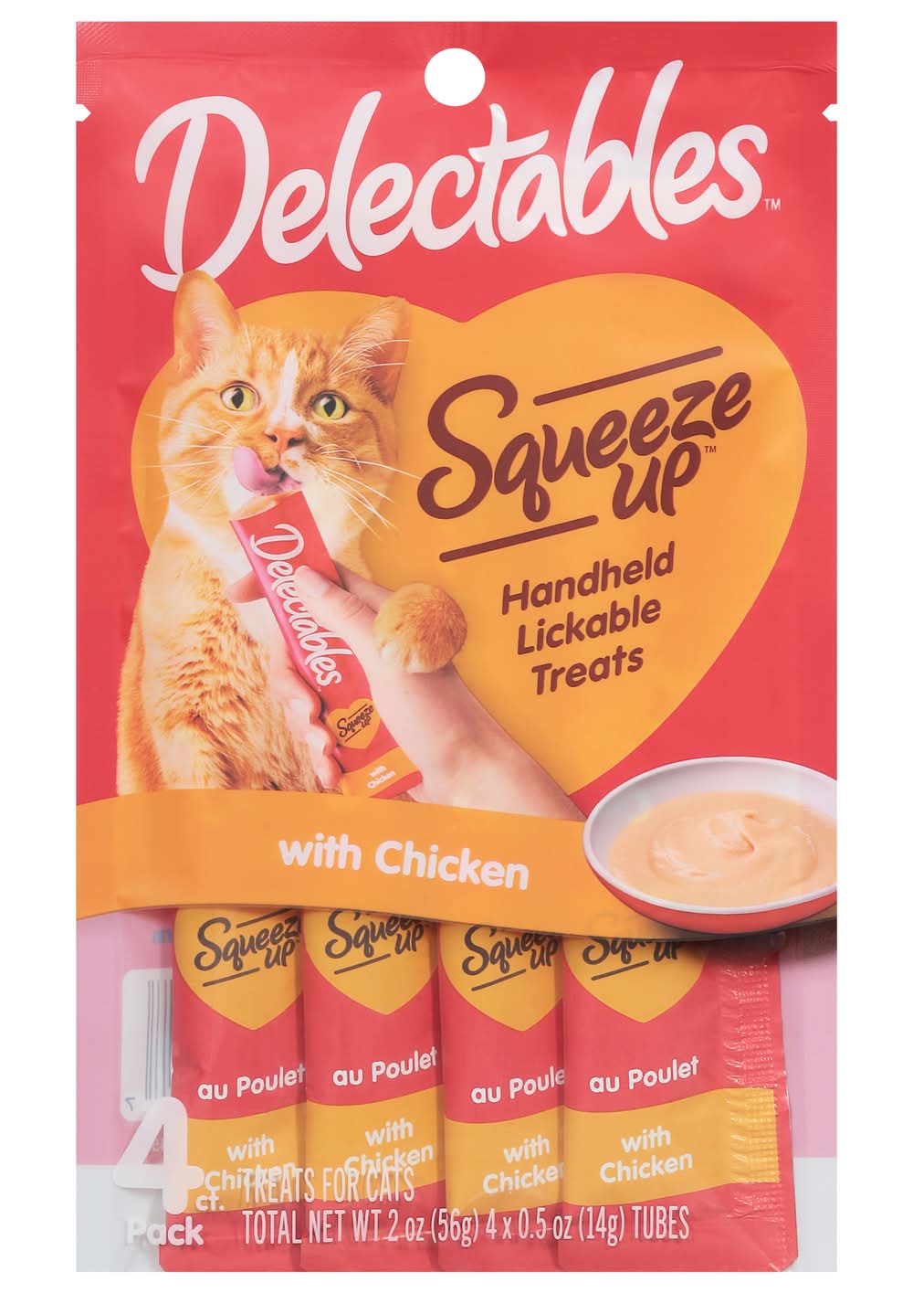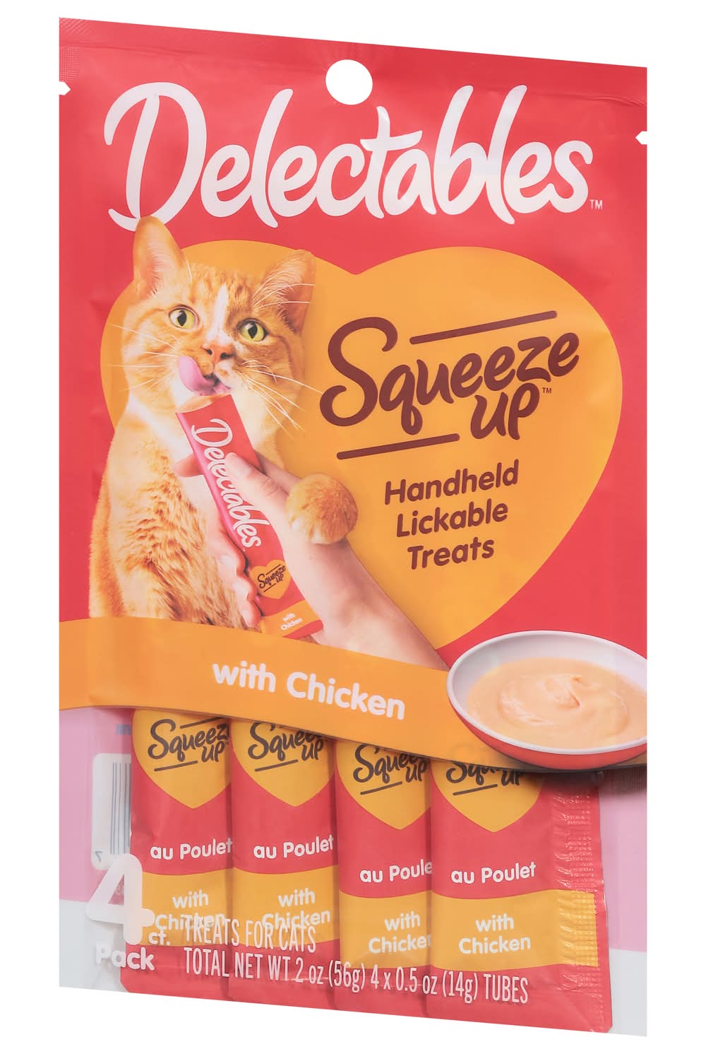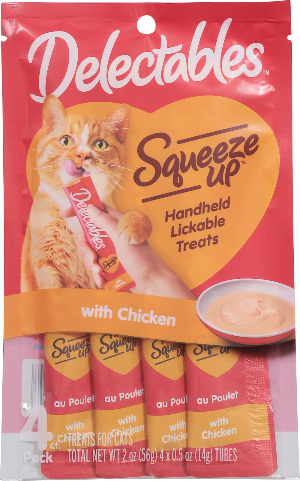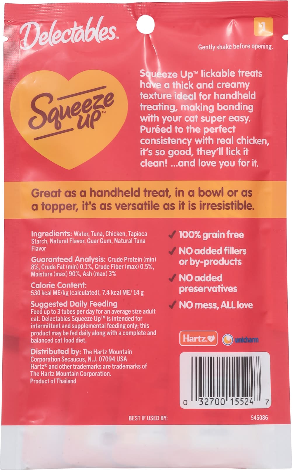 Hartz Delectables Squeeze Up with Chicken is a rich, thick puree in a lickable tube that you can hand feed for a fun and delicious treat. • Pack size: 4 • The Hartz Mountain Corporation, Secaucus, NJ, 07094