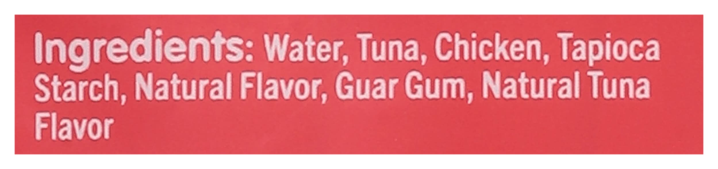 Ingredients: Water, Tuna, Chicken, Tapioca Starch, Natural Flavor, Guar Gum, Natural Tuna Flavor Contains: Fish, Tuna