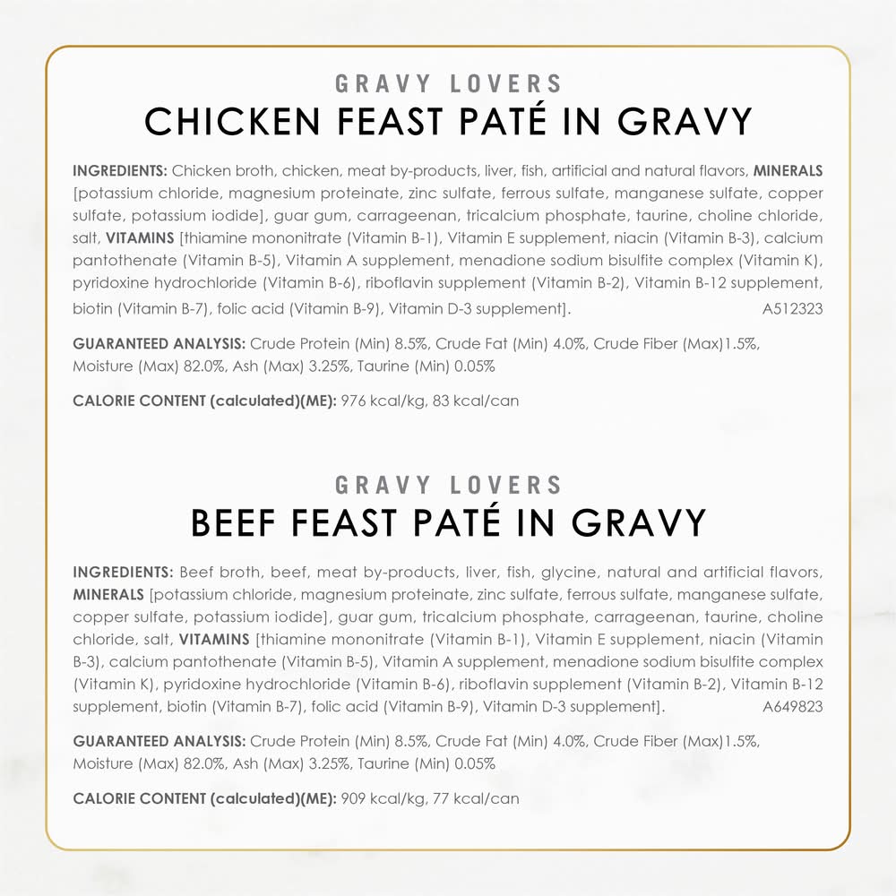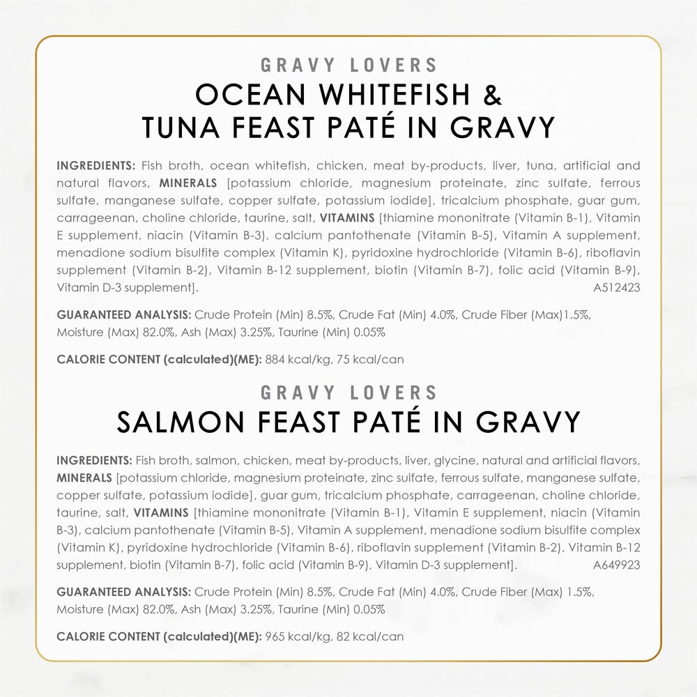 Ingredients: Gravy Lovers Salmon Feast: Fish Broth, Salmon, Chicken, Meat By-Products, Liver, Glycine, Natural And Artificial Flavors, MINERALS [Potassium Chloride, Magnesium Proteinate, Zinc Sulfate, Ferrous Sulfate, Manganese Sulfate, Copper Sulfate, Potassium Iodide], Guar Gum, Tricalcium Phosphate, Carrageenan, Choline Chloride, Taurine, Salt, VITAMINS [Thiamine Mononitrate (Vitamin B-1), Vitamin E Supplement, Niacin (Vitamin B-3), Calcium Pantothenate (Vitamin B-5), Vitamin A Supplement, Menadione Sodium Bisulfite Complex (Vitamin K), Pyridoxine Hydrochloride (Vitamin B-6), Riboflavin Supplement (Vitamin B-2), Vitamin B-12 Supplement, Biotin (Vitamin B-7), Folic Acid (Vitamin B-9), Vitamin D-3 Supplement], . A649923, Gravy Lovers Chicken Feast: Chicken Broth, Chicken, Meat By-Products, Liver, Fish, Artificial And Natural Flavors, MINERALS [Potassium Chloride, Magnesium Proteinate, Zinc Sulfate, Ferrous Sulfate, Manganese Sulfate, Copper Sulfate, Potassium Iodide], Guar Gum, Carrageenan, Tricalcium Phosphate, Taurine, Choline Chloride, Salt, VITAMINS [Thiamine Mononitrate (Vitamin B-1), Vitamin E Supplement, Niacin (Vitamin B-3), Calcium Pantothenate (Vitamin B-5), Vitamin A Supplement, Menadione Sodium Bisulfite Complex (Vitamin K), Pyridoxine Hydrochloride (Vitamin B-6), Riboflavin Supplement (Vitamin B-2), Vitamin B-12 Supplement, Biotin (Vitamin B-7), Folic Acid (Vitamin B-9), Vitamin D-3 Supplement], . A512323, Gravy Lovers Beef Feast: Beef Broth, Beef, Meat By-Products, Liver, Fish, Glycine, Natural And Artificial Flavors, MINERALS [Potassium Chloride, Magnesium Proteinate, Zinc Sulfate, Ferrous Sulfate, Manganese Sulfate, Copper Sulfate, Potassium Iodide], Guar Gum, Tricalcium Phosphate, Carrageenan, Taurine, Choline Chloride, Salt, VITAMINS [Thiamine Mononitrate (Vitamin B-1), Vitamin E Supplement, Niacin (Vitamin B-3), Calcium Pantothenate (Vitamin B-5), Vitamin A Supplement, Menadione Sodium Bisulfite Complex (Vitamin K), Pyridoxine Hydrochloride (Vitamin B-6), Riboflavin Supplement (Vitamin B-2), Vitamin B-12 Supplement, Biotin (Vitamin B-7), Folic Acid (Vitamin B-9), Vitamin D-3 Supplement], . A649823, Gravy Lovers Ocean Whitefish Tuna Feast: Fish Broth, Ocean Whitefish, Chicken, Meat By-Products, Liver, Tuna, Artificial And Natural Flavors, MINERALS [Potassium Chloride, Magnesium Proteinate, Zinc Sulfate, Ferrous Sulfate, Manganese Sulfate, Copper Sulfate, Potassium Iodide], Tricalcium Phosphate, Guar Gum, Carrageenan, Choline Chloride, Taurine, Salt, VITAMINS [Thiamine Mononitrate (Vitamin B-1), Vitamin E Supplement, Niacin (Vitamin B-3), Calcium Pantothenate (Vitamin B-5), Vitamin A Supplement, Menadione Sodium Bisulfite Complex (Vitamin K), Pyridoxine Hydrochloride (Vitamin B-6), Riboflavin Supplement (Vitamin B-2), Vitamin B-12 Supplement, Biotin (Vitamin B-7), Folic Acid (Vitamin B-9), Vitamin D-3 Supplement], . A512423