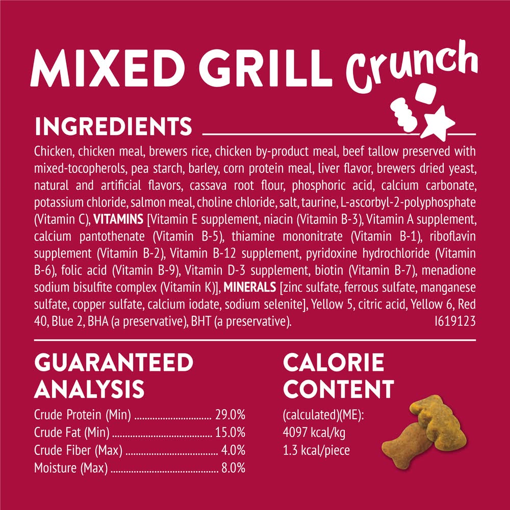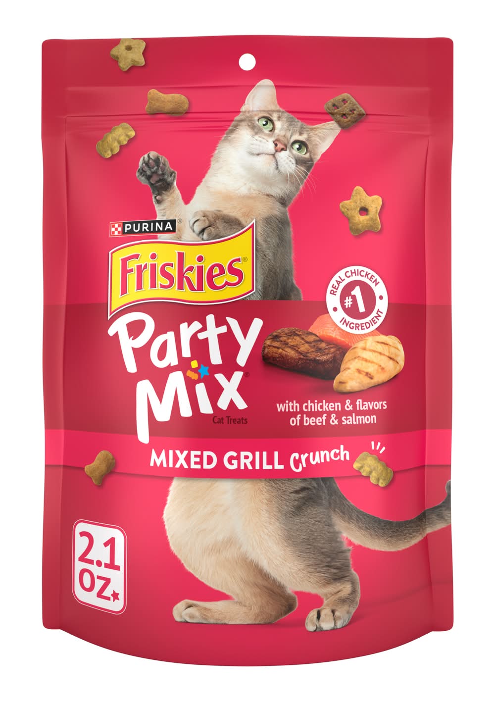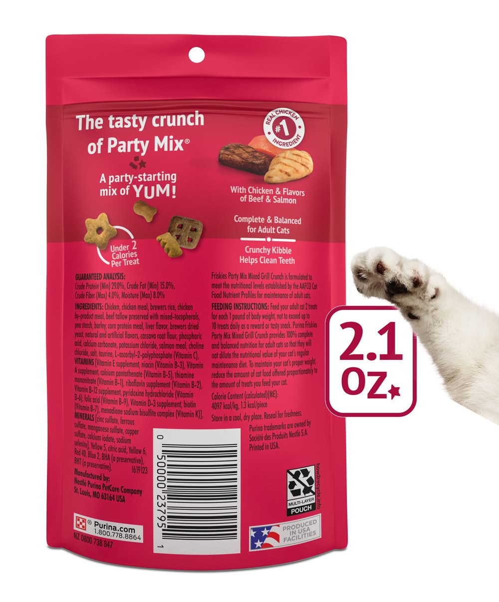 Give your cat a burst of delicious flavor at treat time with Purina Friskies Party Mix Mixed Grill Crunch adult treats for cats. Real chicken is the number 1 ingredient, and every bite delivers a tempting combination of chicken, beef and salmon flavors to please your cat's palate. The satisfying crunchy Friskies cat treats texture is sure to have her licking her lips after every nibble and the intriguing shapes add extra fun to snack time each day. Toss her one of these Friskies treats between meals as a tasty reward for being your best friend or offer up a few pieces whenever you want to spend a few moments cuddling with your cat companion. At less than 2 calories per treat, this Purina Friskies Party Mix cat treats recipe offers a guilt-free way to indulge her cravings for savory, meaty goodness. She gets mouthwatering cat snacks she can't resist, and you get the satisfaction that comes from putting a smile on her face. Nestle Purina Petcare Company, St. Louis, MO 63164