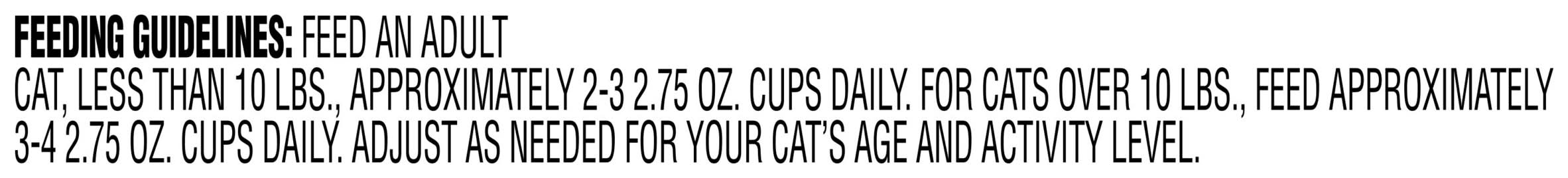 Feeding guidelines: feed adult cats 2 to 3 cups (2.75 oz per cup) per 4.5 pounds of body weight daily. kittens eat up to twice as much per pound of body weight as an adult.
