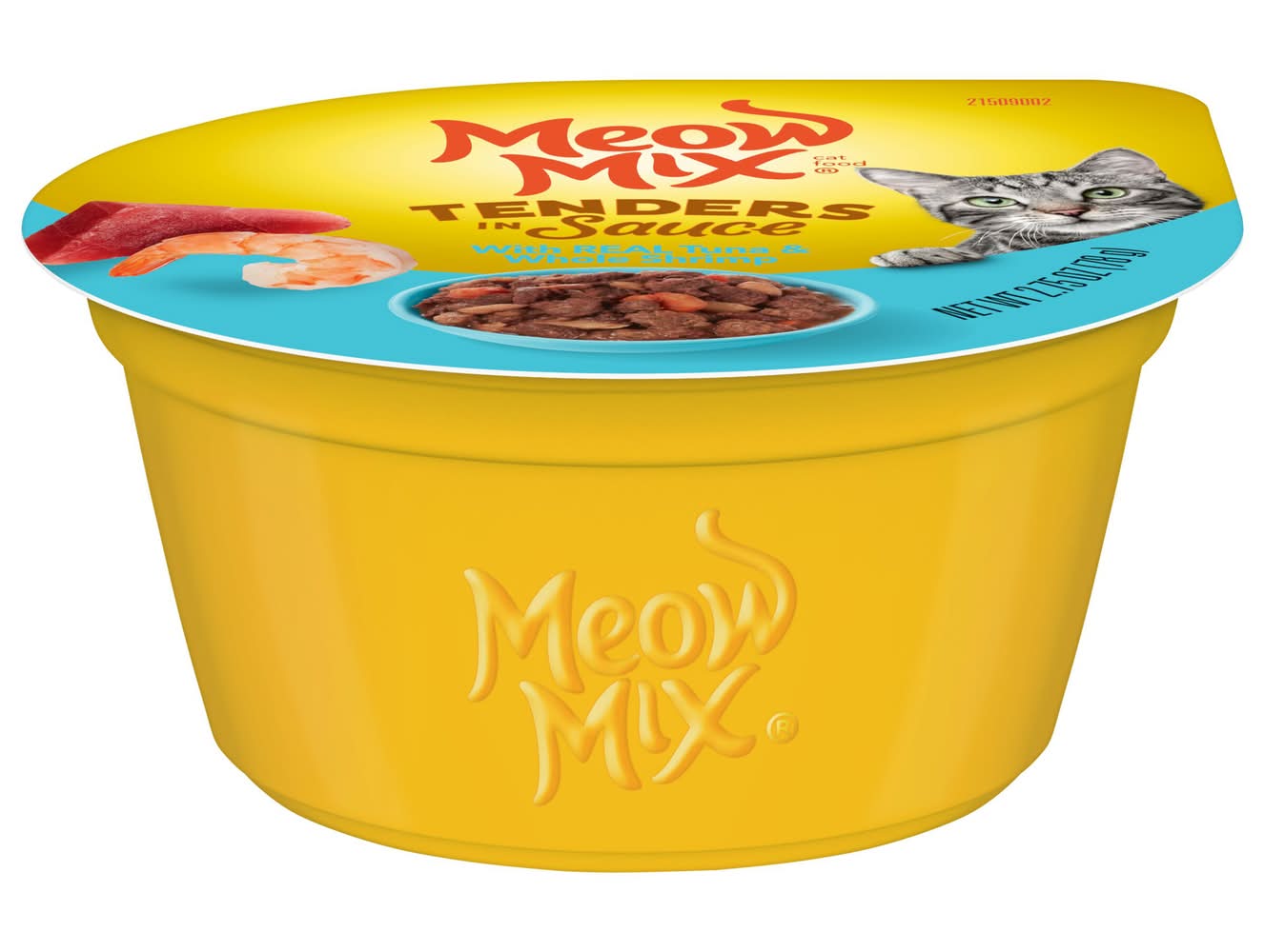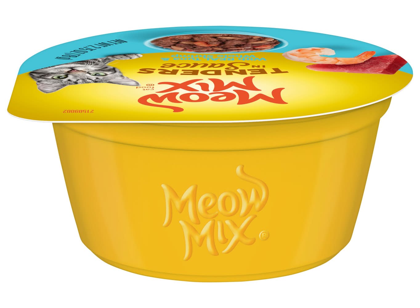 Satisfy your cat′s cravings with Meow Mix Tenders in Sauce, formerly known as Meow Mix Tender Favorites. With delicious, tender pieces of real tuna and whole shrimp in a savory sauce, every bite of this tasty recipe is a hit. It′s no wonder Meow Mix cat food is The Only One Cats Ask for by Name. This irresistible meal provides 100% complete and balanced nutrition for adult cats. And the plastic cups with peel-off lids make mealtime easy, no can opener required. Stock up now to make feeding your cat more fun for both of you. Jm Smucker, San Francisco, CA 94111.