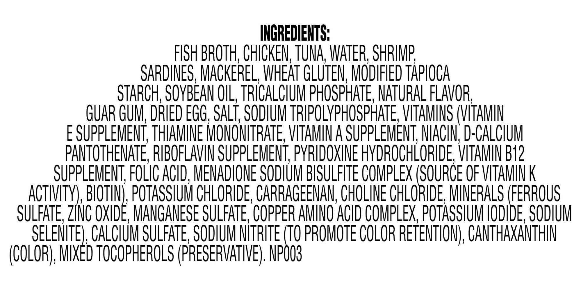 Ingredients: Fish Broth, Chicken, Tuna, Water, Shrimp, Sardines, Mackerel, Wheat Gluten, Modified Tapioca Starch, Soybean Oil, Tricalcium Phosphate, Natural Flavor, Guar Gum, Dried Egg, Salt, Sodium Tripolyphosphate, Vitamins (Vitamin E Supplement, Thiamine Mononitrate, Vitamin A Supplement, Niacin, D-Calcium Pantothenate, Riboflavin Supplement, Pyridoxine Hydrochloride, Vitamin B12 Supplement, Folic Acid, Menadione Sodium Bisulfite Complex (Source Of Vitamin K Activity), Biotin), Potassium Chloride, Carrageenan, Choline Chloride, Minerals (Ferrous Sulfate, Zinc Oxide, Manganese Sulfate, Copper Amino Acid Complex, Potassium Iodide, Sodium Selenite), Calcium Sulfate, Sodium Nitrite (To Promote Color Retention), Canthaxanthin (Color), Mixed Tocopherols (Preservative).