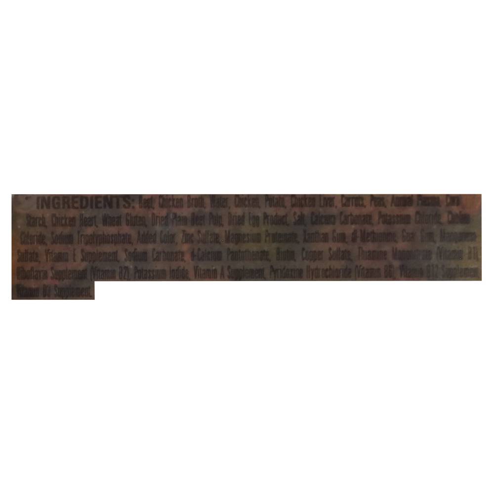 Ingredients: Beef, Chicken Broth, Water, Chicken, Potato, Chicken Liver, Carrots, Peas, Animal Plasma, Corn Starch, Chicken Heart, Wheat Gluten, Dried Plain Beet Pulp, Dried Egg Product, Salt, Calcium Carbonate, Potassium Chloride, Choline Chloride, Sodium Tripolyphosphate, Added Color, Zinc Sulfate, Magnesium Proteinate, Xanthan Gum, DL-Methionine, Guar Gum, Manganese Sulfate, Vitamin E Supplement, Sodium Carbonate, D-Calcium Pantothenate, Biotin, Copper Sulfate, Thiamine Mononitrate (Vitamin B1), Riboflavin Supplement (Vitamin B2), Potassium Iodide, Vitamin A Supplement, Pyridoxine Hydrochloride (Vitamin B6), Vitamin B12 Supplement, Vitamin D3 Supplement. Beef, Chicken Broth, Water, Chicken, Potato, Chicken Liver, Carrots, Peas, Animal Plasma, Corn Starch, Chicken Heart, Wheat Gluten, Dried Plain Beet Pulp, Dried Egg Product, Salt, Calcium Carbonate, Potassium Chloride, Choline Chloride, Sodium Tripolyphosphate, Added Color, Zinc Sulfate, Magnesium Proteinate, Xanthan Gum, dl-Methionine, Guar Gum, Manganese Sulfate, Vitamin E Supplement, Sodium Carbonate, d-Calcium Pantothenate, Biotin, Copper Sulfate, Thiamine Mononitrate (Vitamin B1), Riboflavin Supplement (Vitamin B2), Potassium lodide, Vitamin A Supplement, Pyridoxine Hydrochloride (Vitamin B6), Vitamin B12 Supplement, Vitamin D3 Supplement Contains: Wheat, Gluten, Eggs