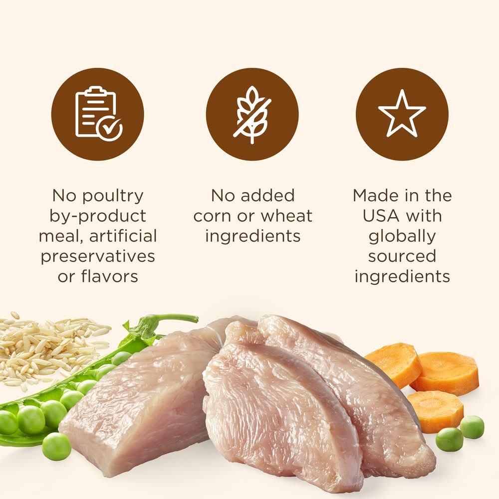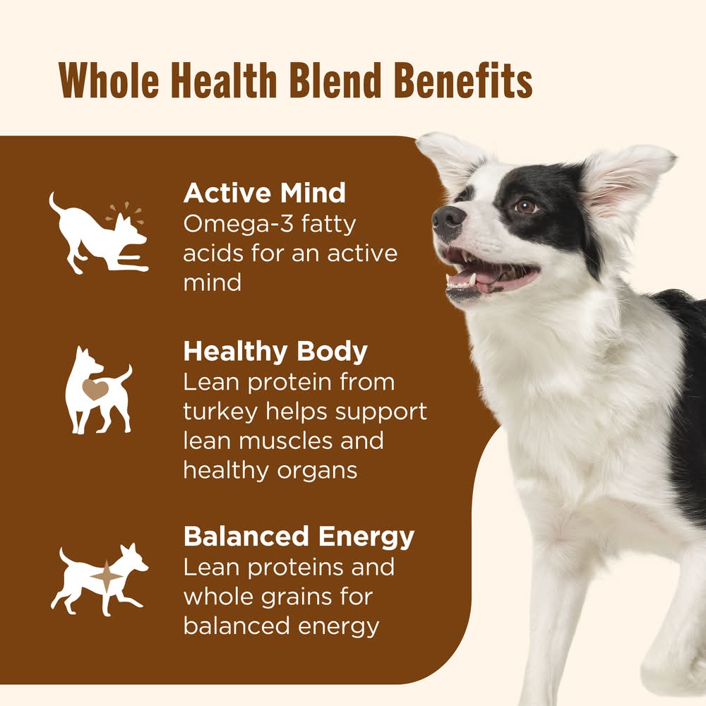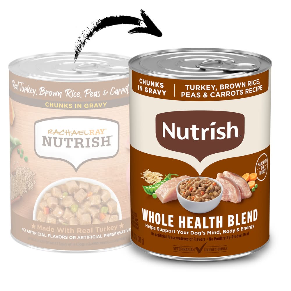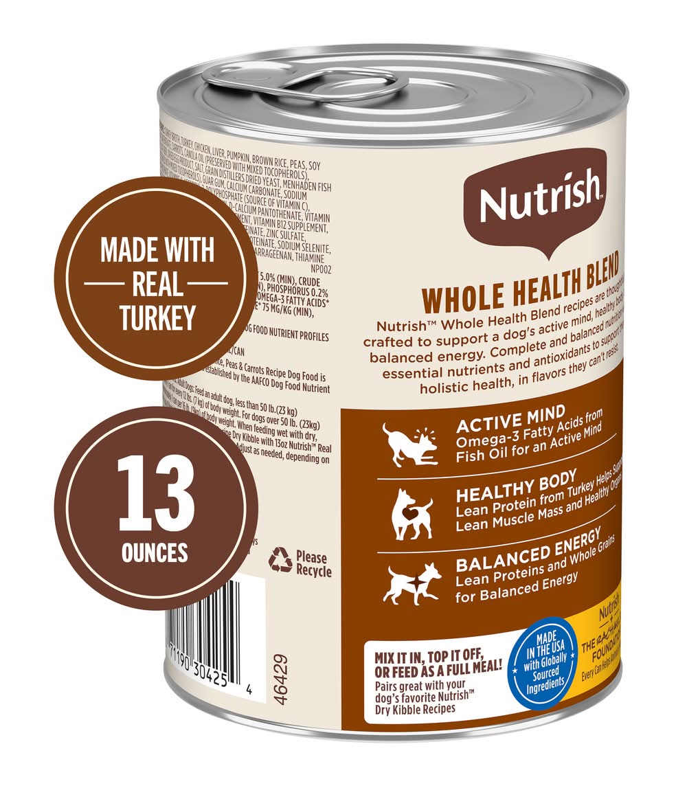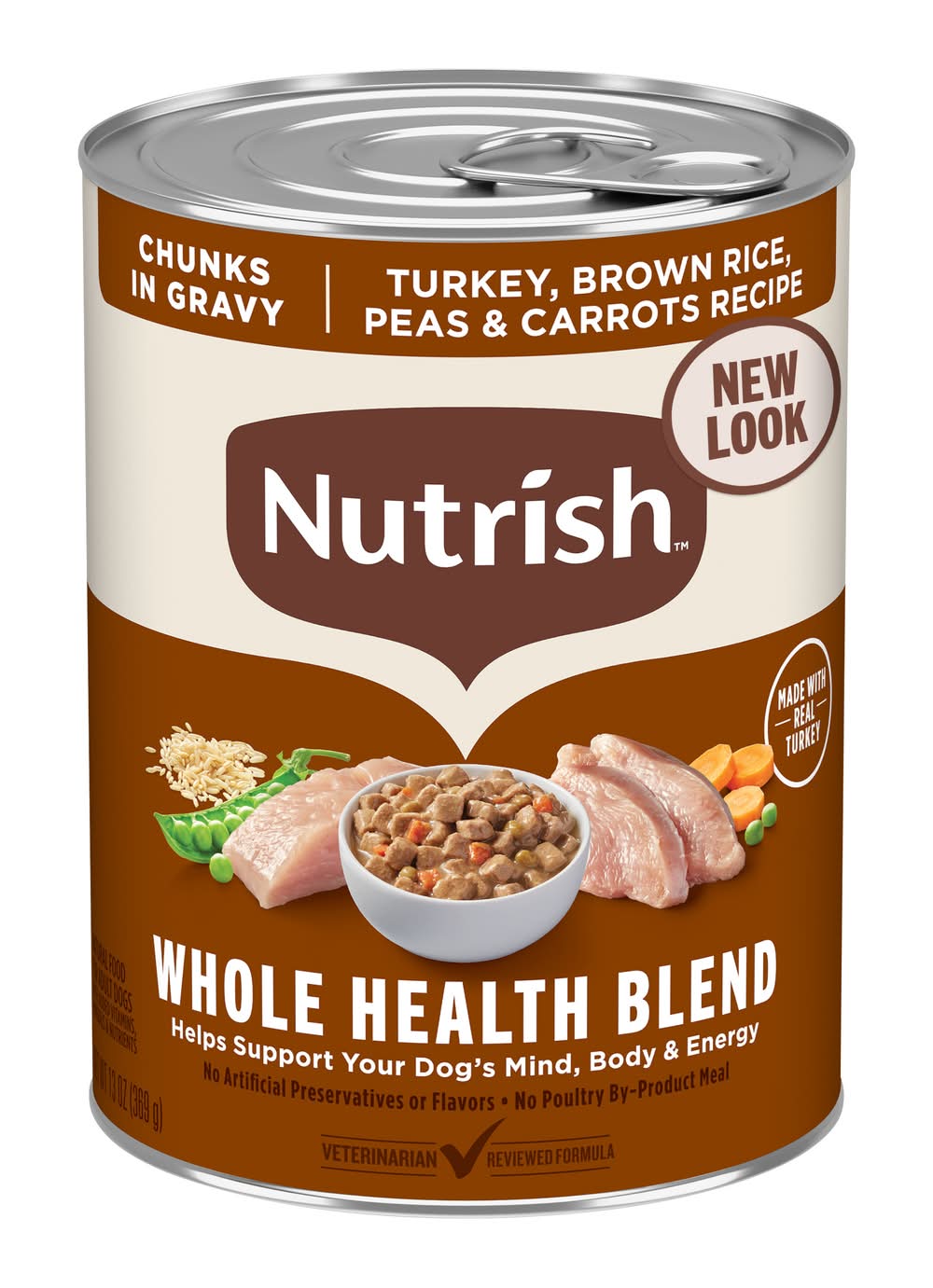 Treat your dog with the hearty and wholesome flavors of Nutrish Real Turkey, Brown Rice, Peas & Carrots Recipe Whole Health Blend Chunks in Gravy Wet Dog Food. This turkey dog food, made with real turkey and real veggie pieces you can see in a savory gravy, is a complete and balanced adult dog food recipe your dog will enjoy. It's formulated with omega-3 fatty acids for an active mind, lean protein from turkey for a healthy body, and whole grains for balanced energy. Plus, this canned dog food is made with no poultry by-product meal, no added corn or wheat ingredients, and no artificial preservatives or flavors. Grab some healthy wet dog food in gravy today and feel good about feeding your pup nutritious meals and knowing that a portion of your purchase goes to The Rachael Ray Foundation to help animals in need.