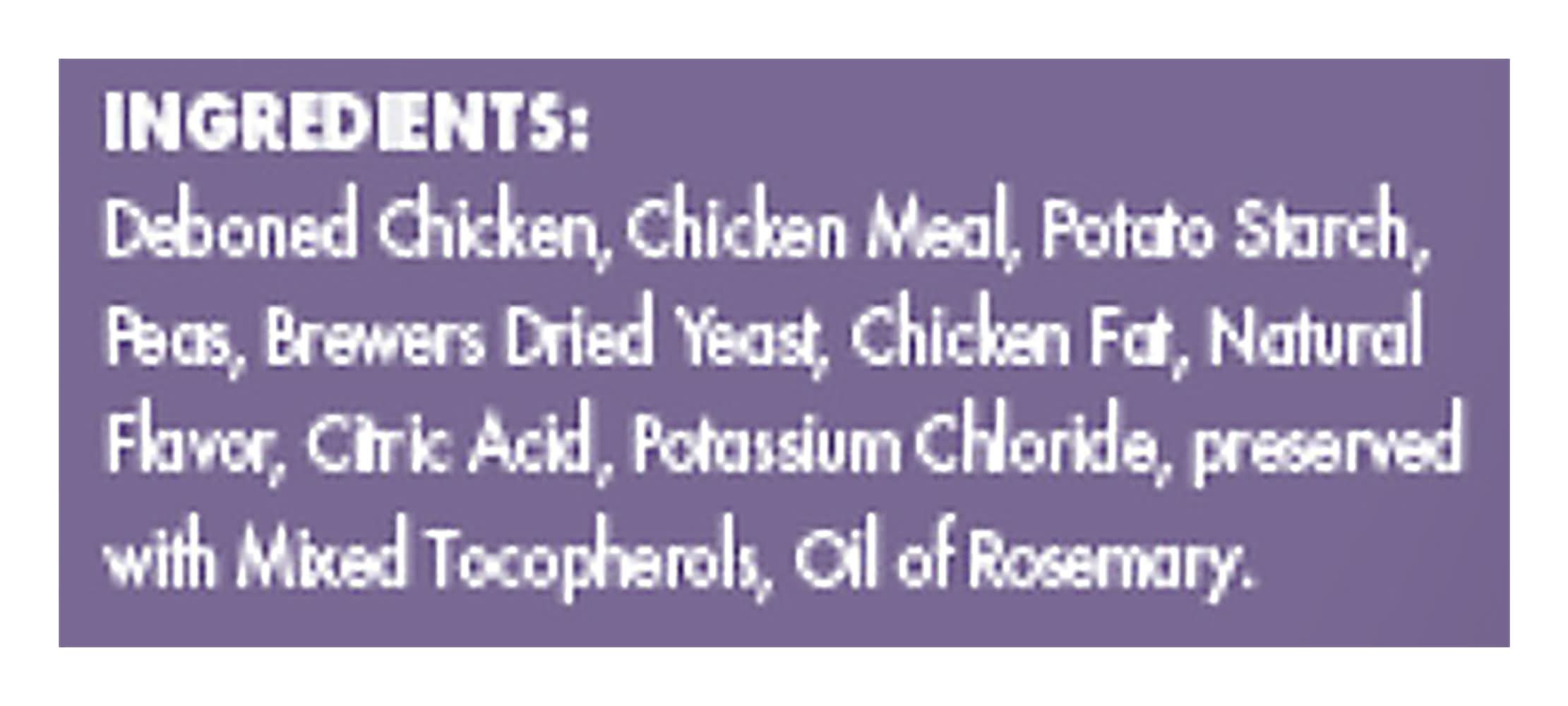 Ingredients: Deboned Chicken, Chicken Meal, Potato Starch, Peas, Brewers Dried Yeast, Chicken Fat, Natural Flavor, Citric Acid, Potassium Chloride, Preserved with Mixed Tocopherols, Oil of Rosemary