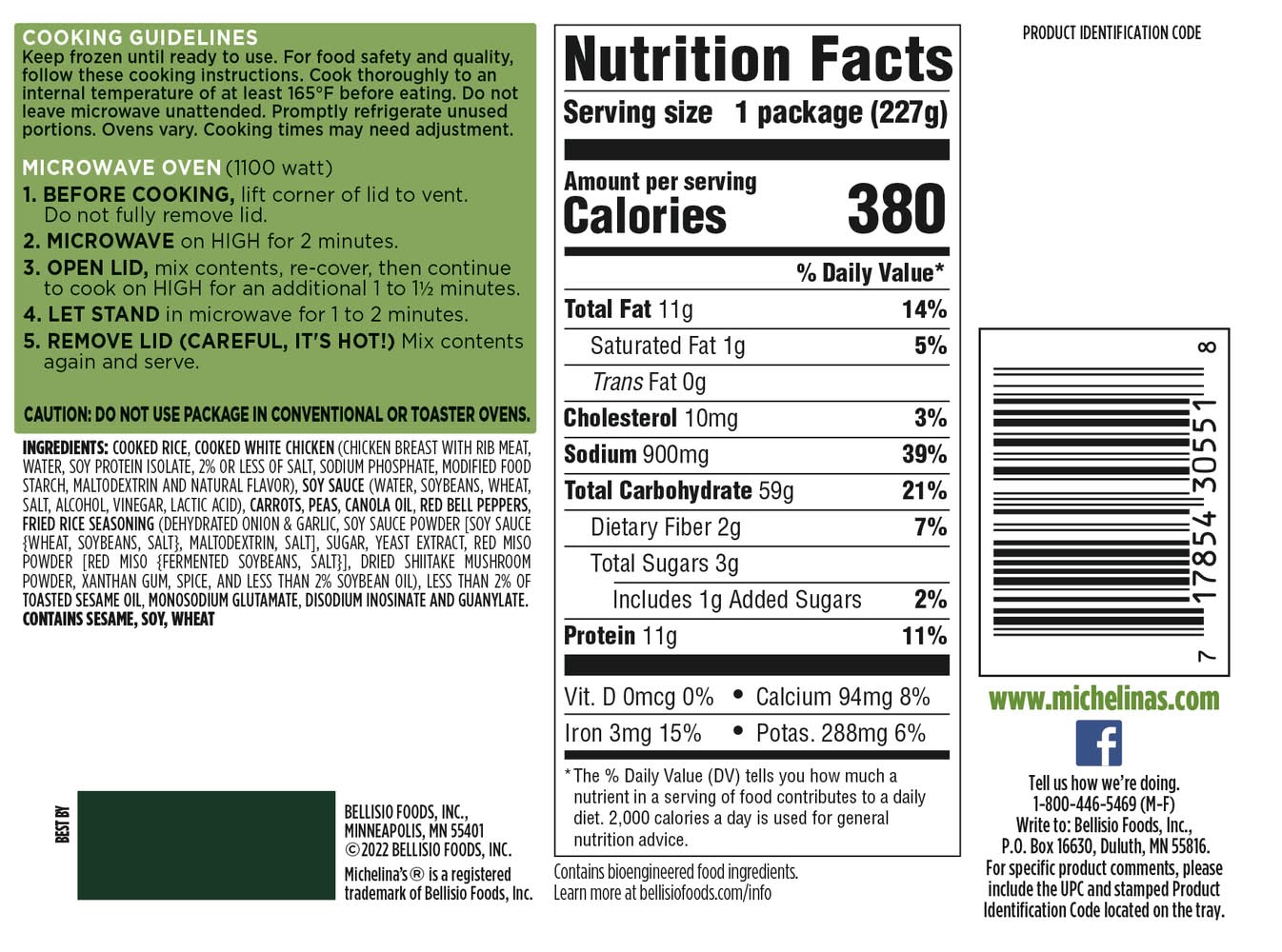 Ingredients: Cooked Rice, Soy Sauce Water, Wheat, Soybeans, Salt, Alcohol, Vinegar, Lactic Acid, Cooked White Chicken Chicken Breast with Rib Meat, Water, Soy Protein Isolate, 2% or Less of Salt, Sodium Phosphate, Modified Food Starch, Maltodextrin and Natural Flavor, Carrots, Peas, Canola Oil, Fried Rice Seasoning Dehydrated Onion & Garlic, Soy Sauce Powder [Soy Sauce {Wheat, Soybeans, Salt}, Maltodextrin, Salt, Sugar, Yeast Extract, Red Miso Powder [Red Miso {Fermented Soybeans, Salt}], Dried Shiitake Mushroom Powder, Xanthan Gum, Spice, and Less than 2% Soybean Oil, Contains Less than 2% of Red Bell Peppers, Toasted Sesame Oil, Salt. Contains: Sesame, Soy, Wheat