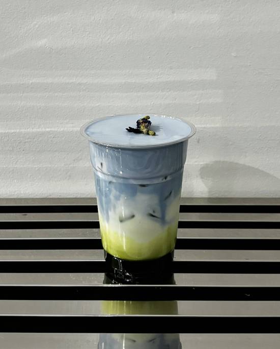 this drink features the earthy richness of ceremonial matcha paired with the smoothness of milk. The vibrant, floral notes of butterfly pea flower grace the top with a striking cream layer