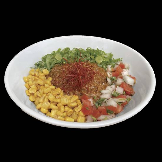 Homemade dry keema curry(Plant meat), pico de gallo(onion, tomato, cilantro), green onion, corn, and shredded chili peppers.