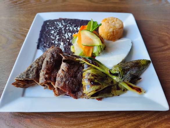 Grilled Oaxacan Style Steak | Nopal | Queso Fresco | Rice | Beans | Corn Tortillas.