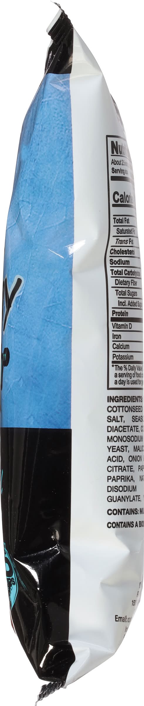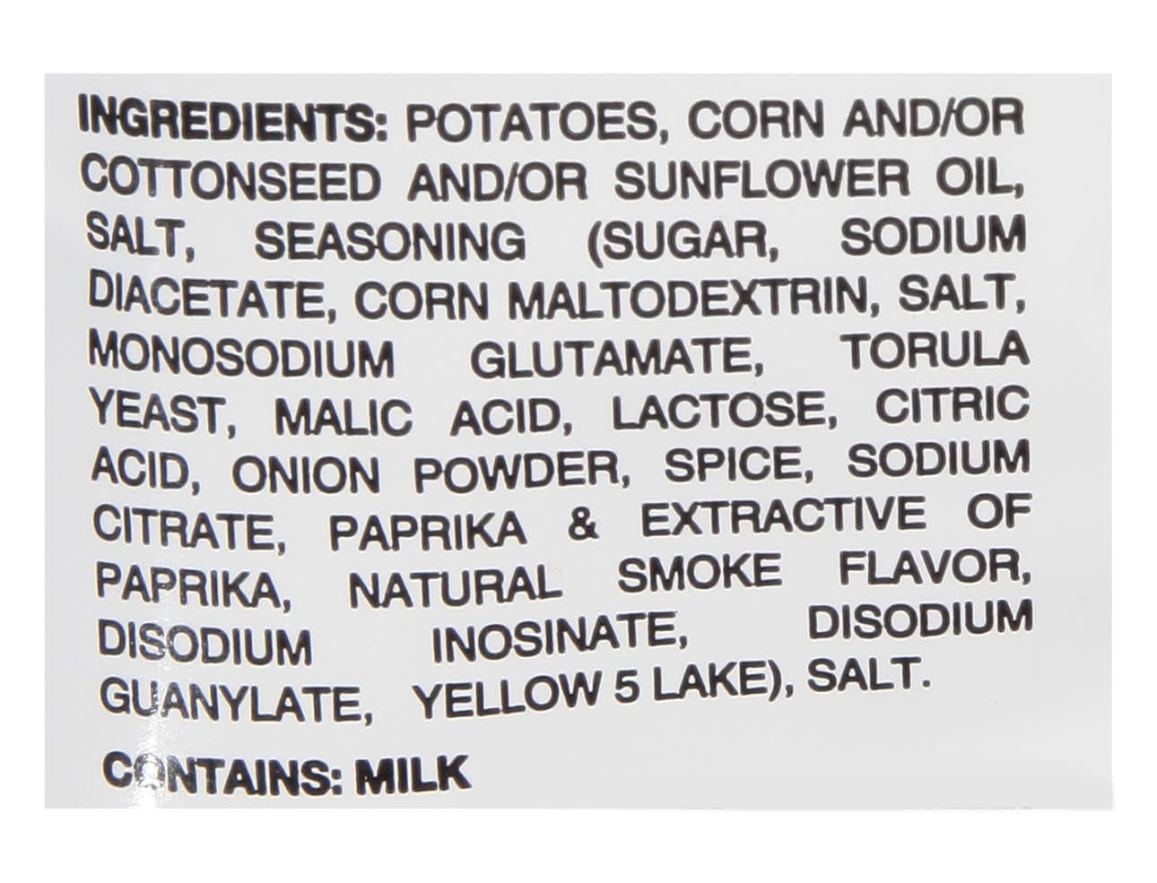 Ingredients: Potatoes, Corn and/or Cottonseed and/or Sunflower Oil, Salt, Seasoning (Sugar, Sodium Diacetate, Corn Maltodextrin, Salt, Monosodium Glutamate, Torula Yeast, Malic Acid, Lactose, Citric Acid, Onion Powder, Spice, Sodium Citrate, Paprika & Extractive of Paprika, Natural Smoke Flavor, Disodium Inosinate, Disodium Guanylate, Yellow 5 Lake), Salt Contains: Milk, Corn, Lactose