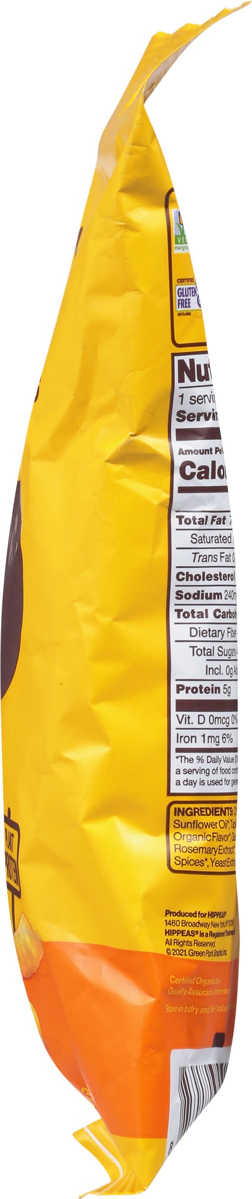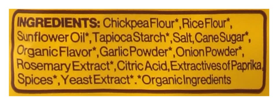 Ingredients: Chickpea Flour (Organic Ingredients), Rice Flour, Sunflower Oil (Organic Ingredients), Tapioca Starch (Organic Ingredients), Salt, Cane Sugar Organic Flavor (Organic Ingredients), Garlic Powder (Organic Ingredients), Onion Powder (Organic Ingredients), Rosemary Extract (Organic Ingredients), Citric Acid, Extractives of Paprika Spices Yeast Extract