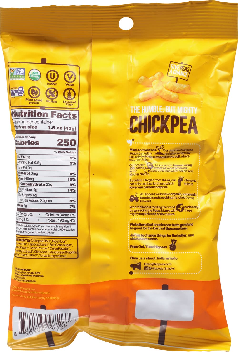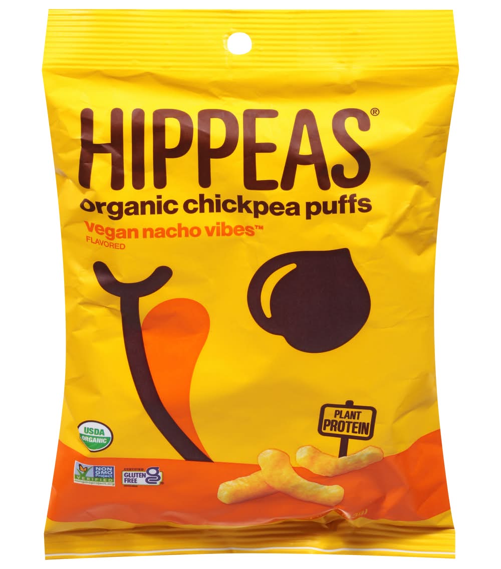 Chickpea Puffs, Organic, Vegan Nacho Vibes • Brand: Hippeas • vegan, gluten-free, kosher, organic, GMO-free • Hippeas, 245 Newtown Road, Suite 101, Plainview, NY, 11803