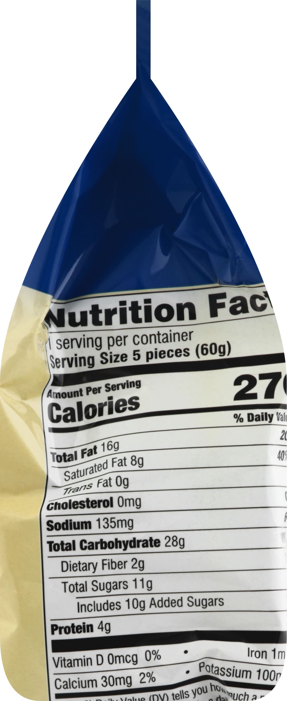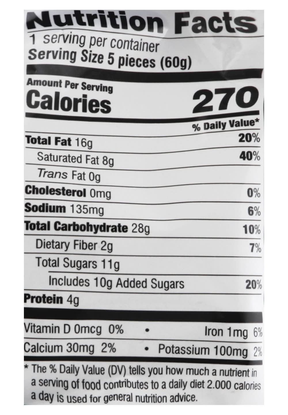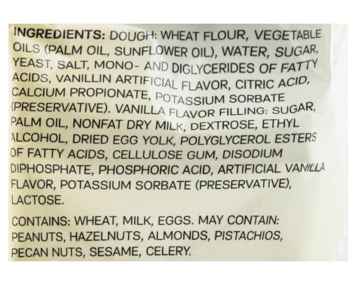 Ingredients: Dough: Wheat Flour, Vegetable Oils (Palm Oil, Sunflower Oil), Water, Sugar, Yeast, Salt, Mono- and Diglycerides of Fatty Acids, Vanillin Artificial Flavor, Citric Acid, Calcium Propionate, Potassium Sorbate (Preservative), Vanilla Flavor Filling Sugar, Palm Oil, Nonfat Dry Milk, Dextrose, Ethyl Alcohol, Dried Egg Yolk, Polyglycerol Esters of Fatty, Acids, Cellulose Gum, Disodium Diphosphate, Phosphoric Acid, Artificial Vanilla Flavor, Potassium Sorbate (Preservative) Lactose Contains: Wheat, Milk, Eggs, Peanuts, Tree Nuts, Sesame